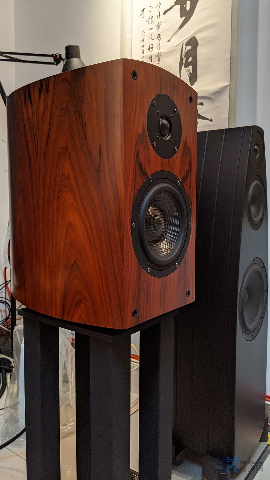 鉴赏会的前一日有一位重庆发烧友联系笔者想来步月斋影音试听一下器材,预约到活动当天的上午,他先是不知道有这次活动,也不了解H&C品牌及其产品。5月24日的上午这位发烧友携带家眷到步月斋影音电器工作室(重庆),当他看到脚架上放置的H&C之PH165书架箱后首先觉得外观很漂亮,箱体颜色是酸枝红木皮,水滴弧形的造型别致大方,掂量了一下重量感觉很沉,估计有十几公斤。当播放了蔡琴的“机遇”后,这位发烧友感慨没想到国产音箱也能有这么好的声音,通透、饱满、大气,在问了只有几千元的价格后更是觉得超值。先听的是丝膜高音版本,后来又让笔者更换试听了铍膜高音的版本,同样的曲目对比,铍膜高音版本确实比丝膜高音版本在高频延伸和清晰度上更上一层楼。(本次活动试听鉴赏的PH165均为功率分频版/被动分频)