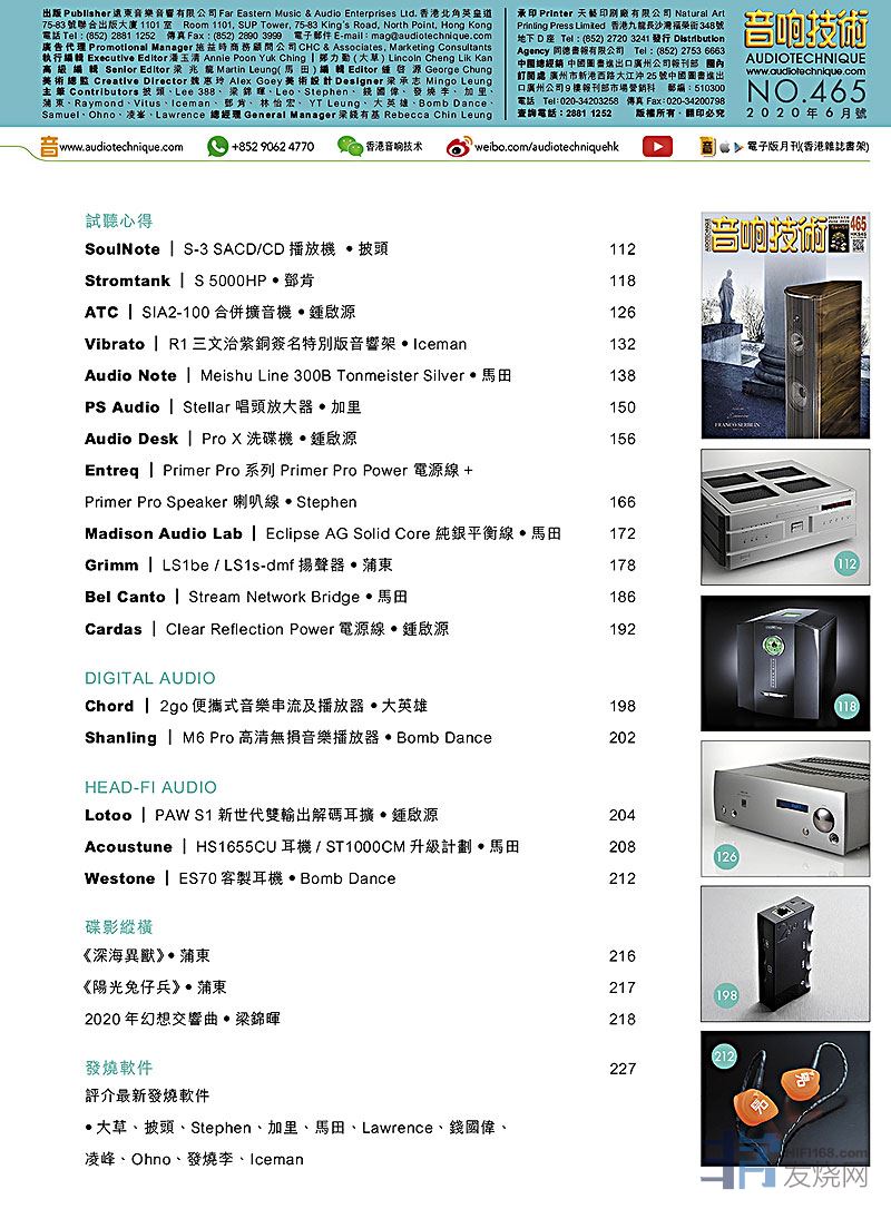 今期封面专题由大草、马田评论Franco Serblin Accordo Essence扬声器,专题特稿:Audio Exotics中环Audio Room友情结盟带来全新突破、HSE + Extreme Exotics 在草庐,其他评论文章包括:SoulNote S-3 SACD/CD播放机、Stromtank S 5000HP、ATC SIA2-100合并扩音机、Vibrato R1三文治紫铜签名特别版音响架、Audio Note Meishu Line 300B Tonmeister Silver 、PS Audio Stellar 唱头放大器、Audio Desk Pro X 洗碟机、Entreq Primer Pro系列 Primer Pro Power 电源线+Primer Pro Speaker 喇叭线、Madison Audio Lab Eclipse AG Solid Core 纯银平衡线、Grimm LS1be / LS1s-dmf扬声器、Bel Canto Stream Network Bridge、Cardas Clear Reflection Power电源线、Chord 2go便携式音乐串流及播放器、Shanling M6 Pro高清无损音乐播放器、Lotoo PAW S1新世代双输出译码耳扩、Acoustune HS1655CU耳机/ ST1000CM升级计划 、 Westone ES70客制耳机 .....,详细内容请参阅目录。