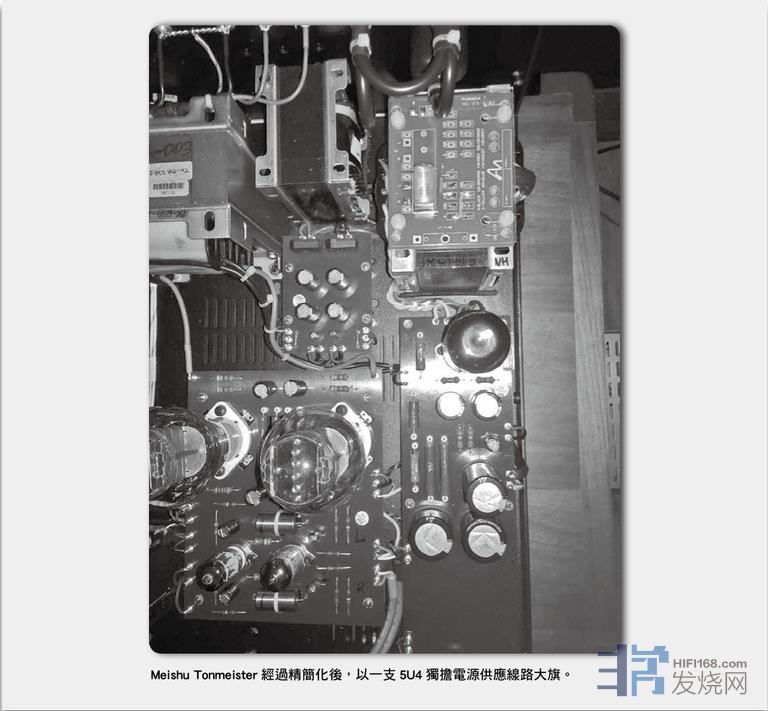 “Meishu Tonmeister 输入级已改为以一支 12AU7 推一支 5687,而这配搭正是取材自Ongaku和Jinro。Meishu Tonmeister 的电源供应线路亦同样贯彻这简单是美的概念,于是由以往的 5U4 配6SN7 和 6X5,改为单独一支5U4,而电源牛和扼流圈亦改为各一只。Meishu Tonmeister 在另一关键位置上却又加料炮制,那就是在推动级之间加入牛交连。须知牛教连必会令声音更稳定和厚润,况且 Audio Note 的手本之一,正在于自家绕制的火牛。翻查厂方数据,原来 Meishu Tonmeister 比 Meishu 还要重多两公斤!”