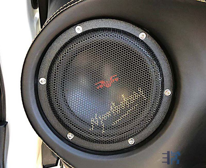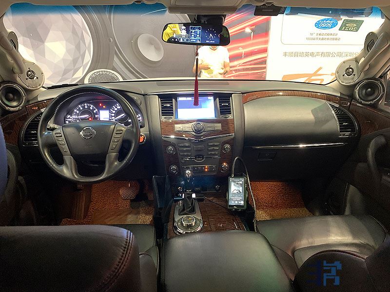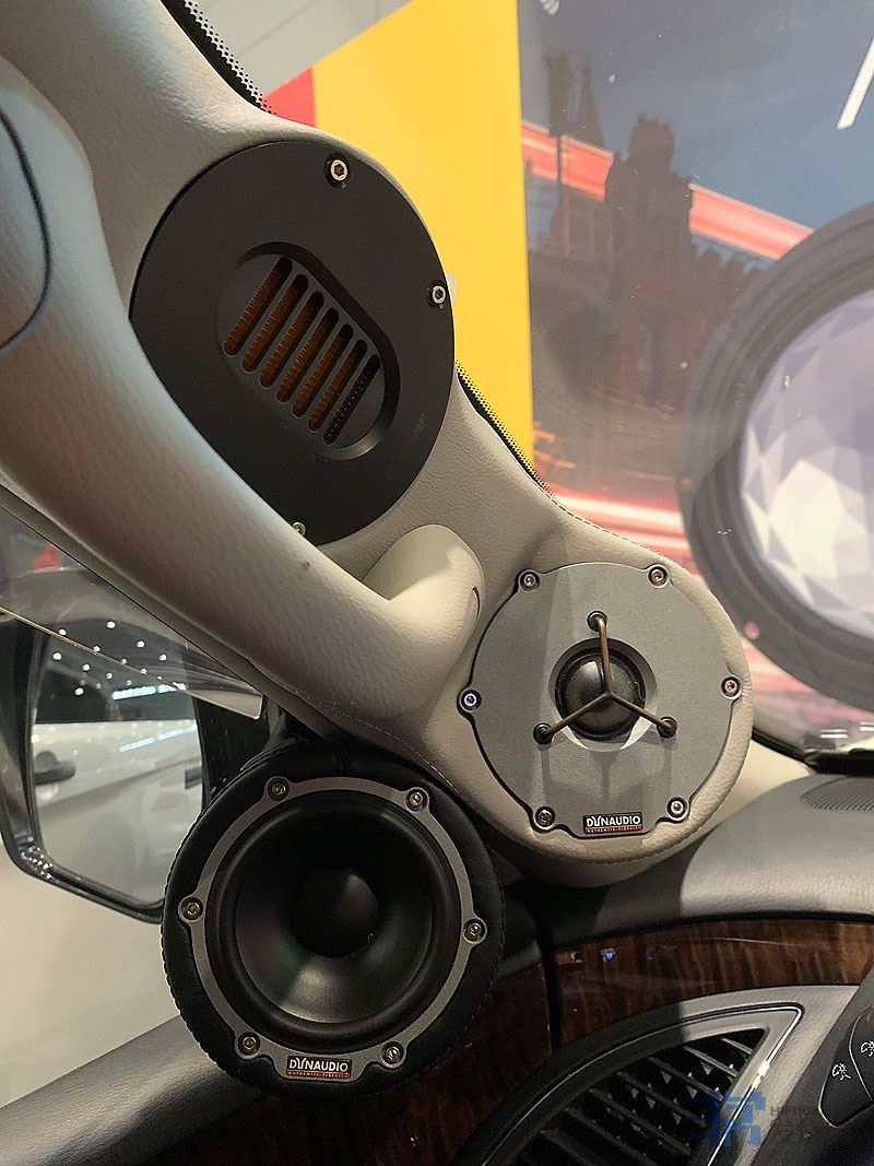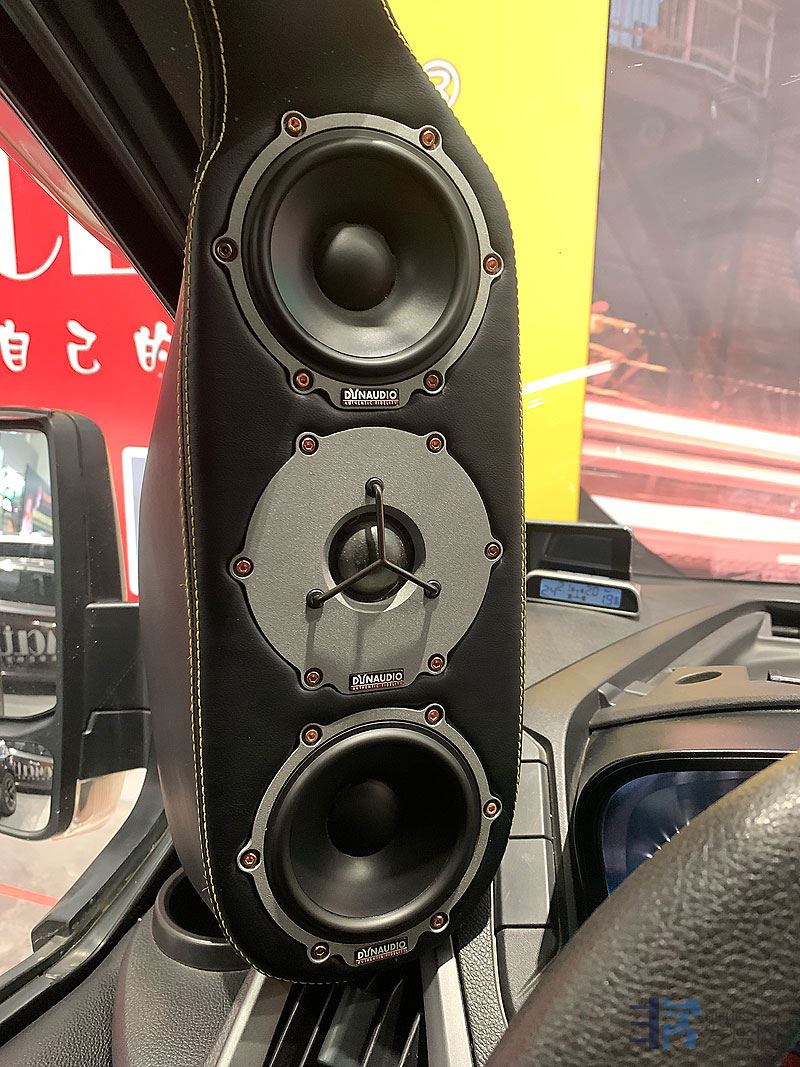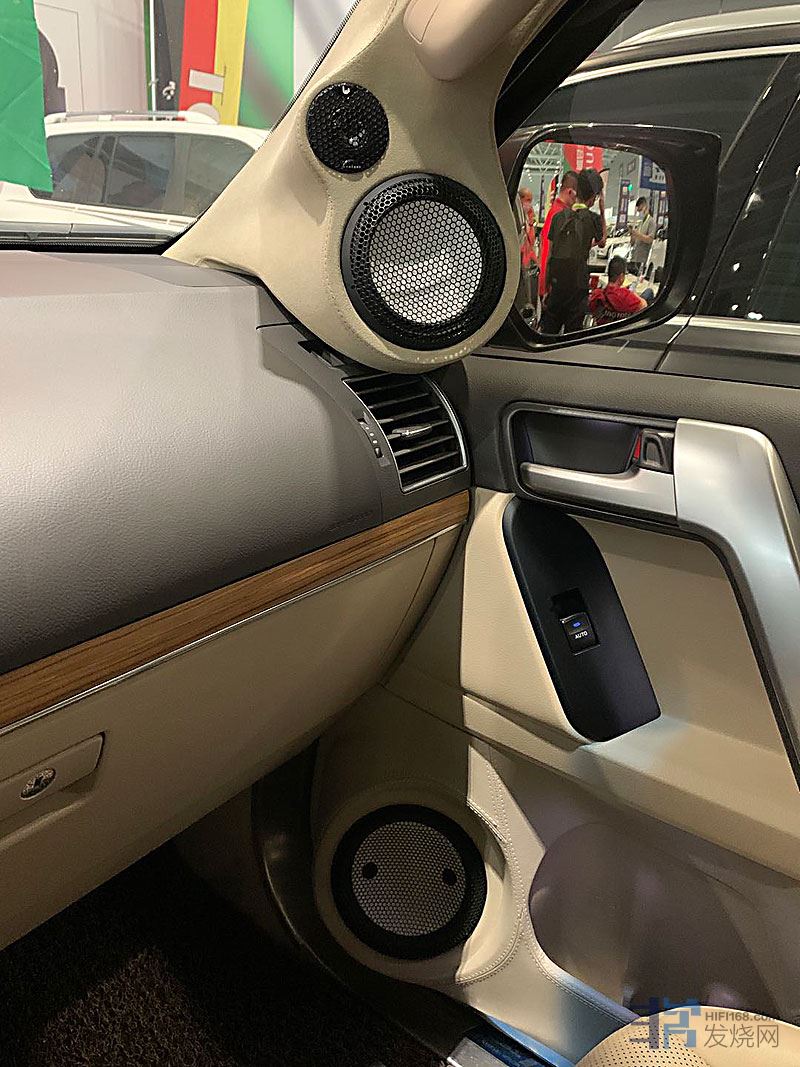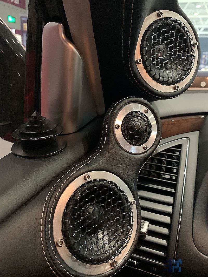 陶瓷高音、防弹布+棉布+碳纤维的三文治振膜中音,经过改装A柱和左右前门来增加喇叭单元。