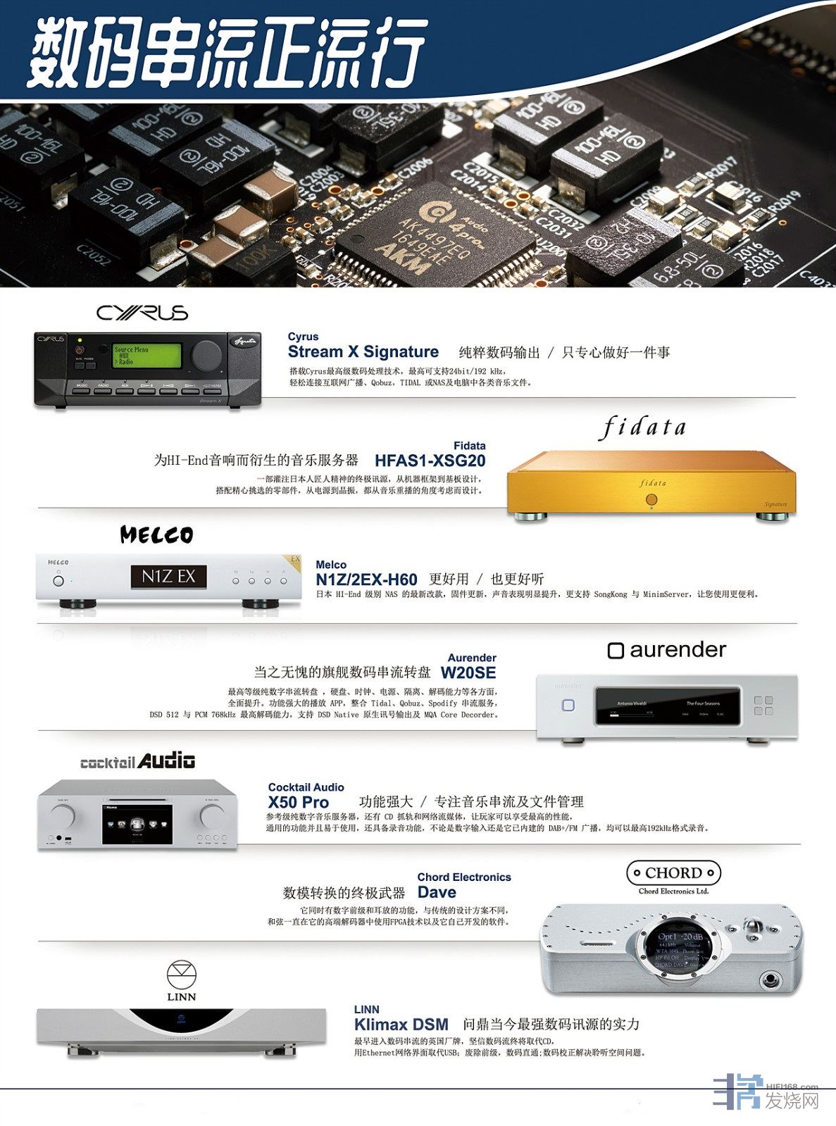 当我们和音响业者们谈及未来主流音源形式时,几乎一致认为未来就是网络流媒体的世界,聆听音乐的习惯改变,势必也引发了重播硬件器材领域的地震,发烧友们以往习惯了用CD机、黑胶唱盘、等器材来听音乐,如今如何适应新趋势呢?网络流媒体播放的方式是多种多样的,今天我就向大家推荐7款目前市售高级数码串流设备系备。为希望能够便捷地赶上串流音乐播放潮流的发烧友们介绍一下。