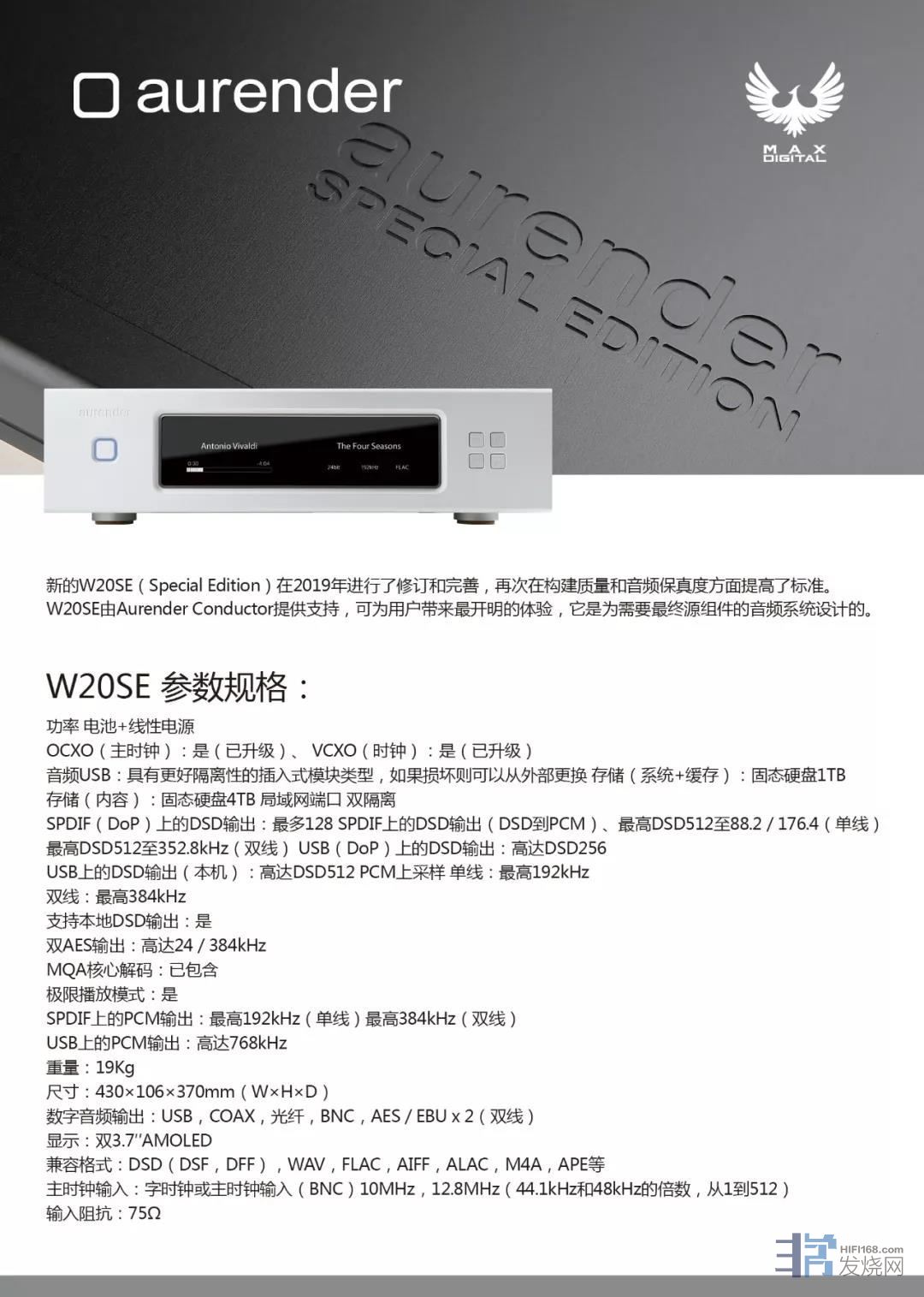 W20SE输出的档案规格也提升了,不仅USB输出一举提升到DSD512与768kHz PCM,就连S/PDIF界面的最高输出也从192kHz PCM提升到384kHz PCM,方法是W20SE提供了双线AES/EBU输出,因此能将输出取样率倍增。此外,W20SE也能将DSD转成PCM透过S/PDIF界面输出,以方便连接没有USB DAC功能的DAC。藉由FPGA芯片,W20SE还新增了PCM升频功能,能将PCM讯号最高升频至384kHz后再输出。为求最好的播放音质,W20SE新增「极致模式」功能,当播放音乐时会把一切不相关的功能全都关闭,只保留与音乐播放有关的功能。