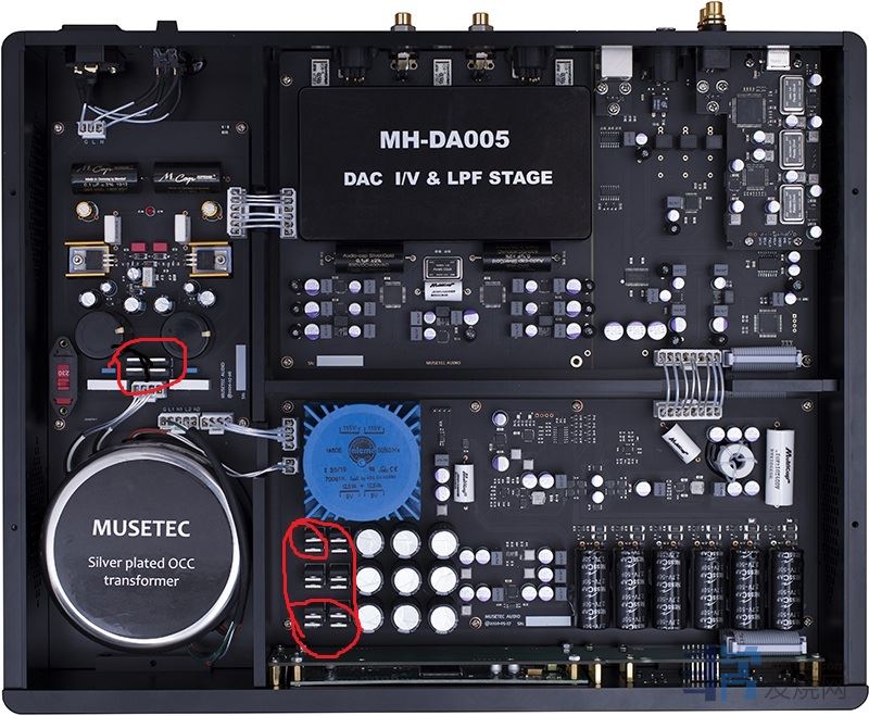 电源对于音响系统而言,至关重要。沐声从DA001开始,就一直非常重视电源设计。比如,双50瓦环牛供电、数字模拟电路分离供电、优质整流管、优质电解电容,以及多路独立稳压电路、镜像恒流源电路,等等。