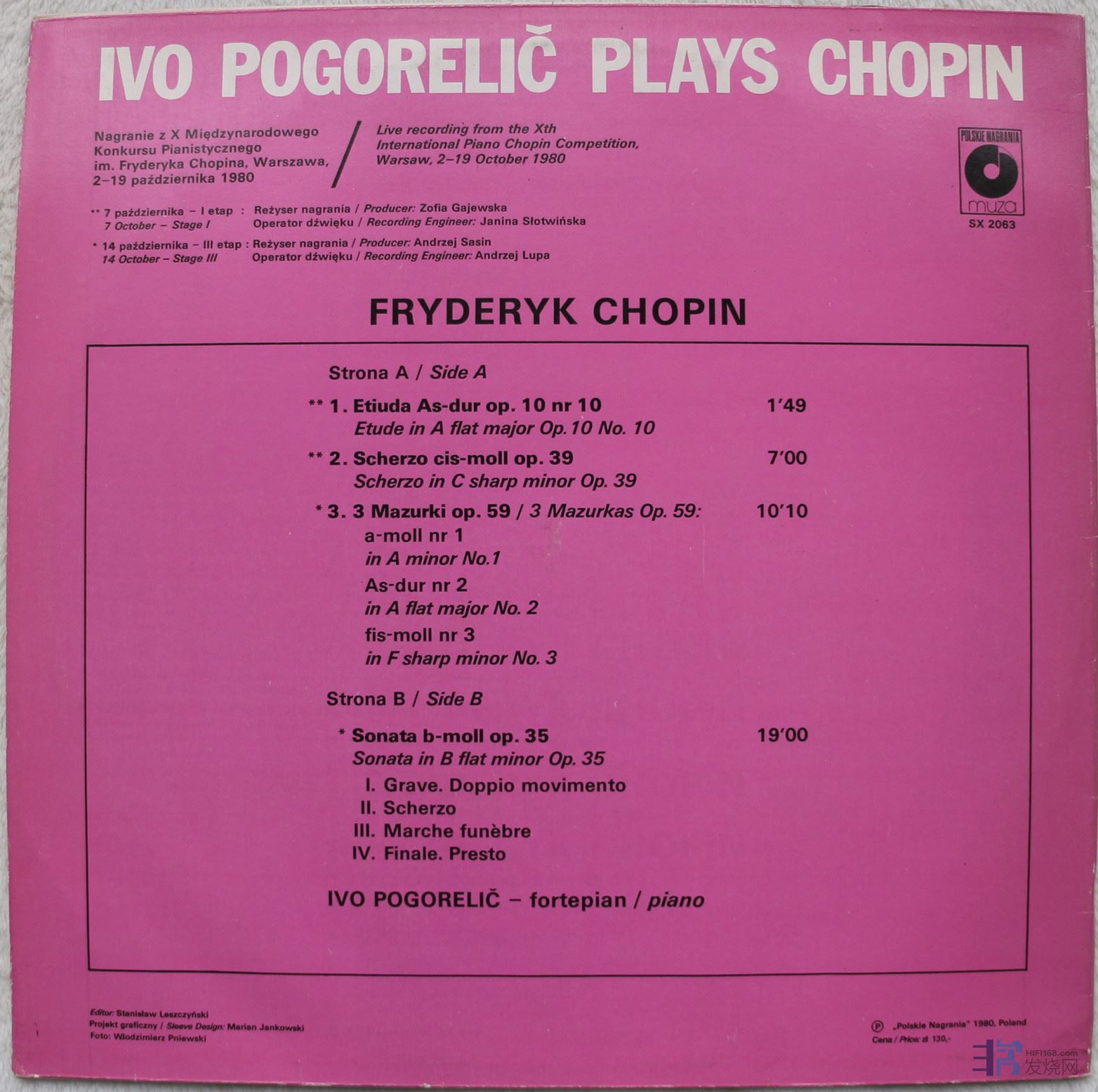 唱片曲目:肖邦第二奏鸣曲,练习曲op.10 no.10,第三戏谑曲op.39, 玛祖卡op.59等