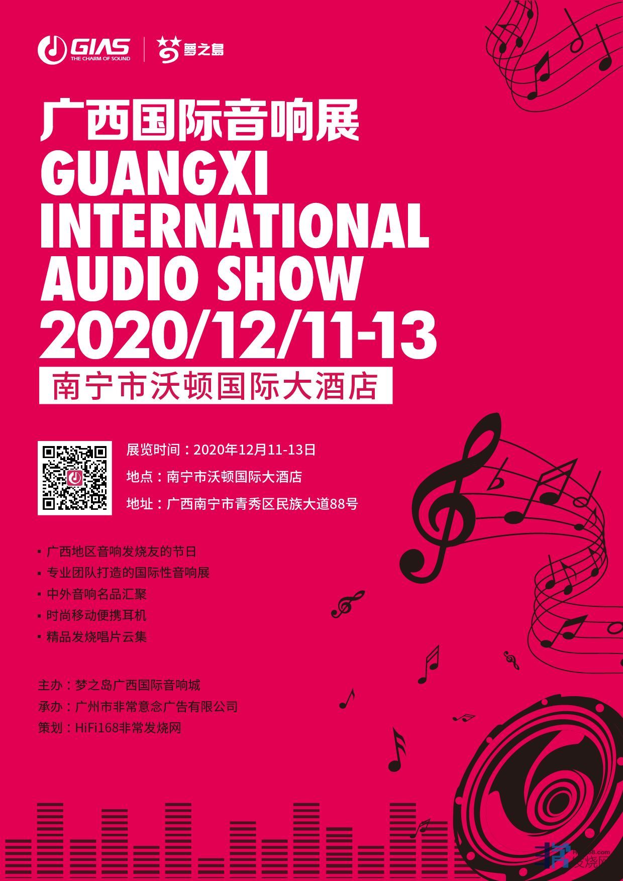 广西国际音响展由广西知名企业广西梦之岛(集团)主办,并由拥有20多年策划音响展会经验的广州市非常意念广告有限公司承办,以及非常发烧网HiFi168进行策划。广西梦之岛(集团)是一家扎根广西、以零售业为主的商业集团。目前在南宁、桂林、柳州、梧州、贵港、钦州等广西主要城市拥有十多个经营体。经营业态包含百货、购物中心、大型超市、生活超市、便利店、音响城。梦之岛已成为南宁这座靓丽之城的时尚名片。