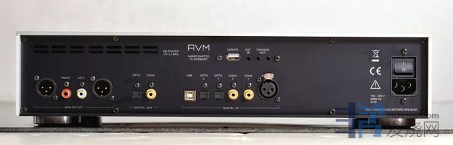 CD3.2MK2拥有强大的数字讯号输入接口:包括USB-B供连接PC、光纤和同轴各两组,除此之外还有一组AES/EBU,因此即使专业的DAT等器材都可以连接使用,提供多元化的使用选择。数码输出方面则提供同轴和光纤各一组;模拟输出则提供RCA单端和XLR平衡各一组。另外机器背板上注明了HandCrafted in Germany(德国手工制作)的字样,表明了AVM坚持原厂品质的理念。