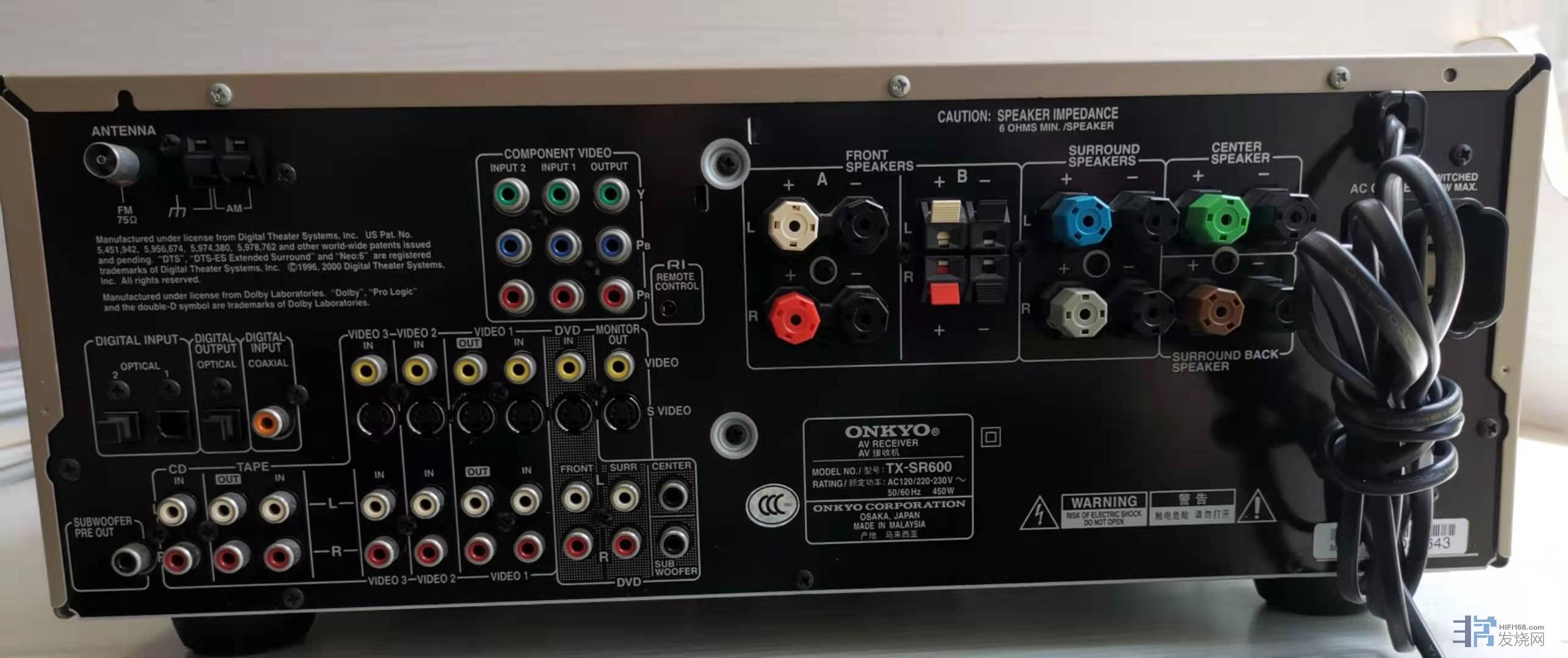 ONKYO安桥TX-SR600 DTS功放,原装220V 马来西亚产地机器6.1声道,支持DTS-ES解码,支持同轴光纤输入。TX-SR600备有6声道,总音乐功率870W,每声道输出达145W(6ohm/1kHz/JEITA),音响格式有杜比数码、杜比数码EX、DTS、DTS Discrete/Matrix 6.1,还有杜比Pro Logic2及DTS Neo:6。除了外形出众外,TX-SR600还继承了不少旗舰级机种的设计,例如Optimum Gain Volume Circuitry,可有效避免在低音量时,声音低至基层噪音所造成的失真。还有Onkyo驰名的WRAT设计,可对应SACD/DVD-Audio的超高频,即使在一般的音响播放下,它的中高频表现亦较突出。前左右声道备有24bit/192kHz译码,其它声道亦有24bit/96kHz。安桥TX-SR600 6.1声道数码环绕声影音功放机