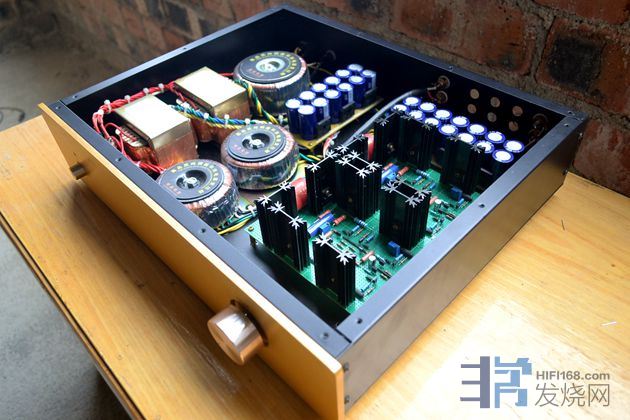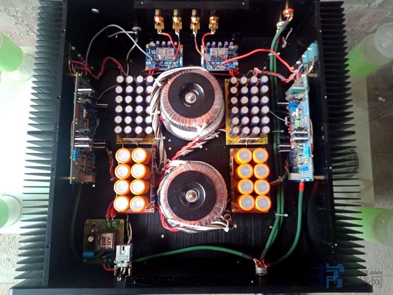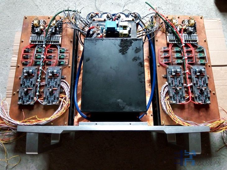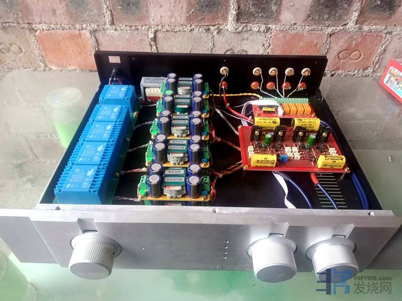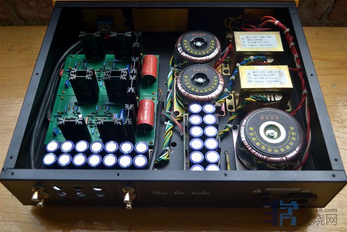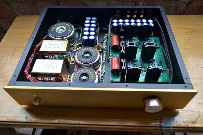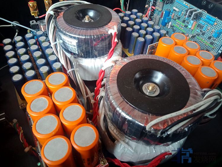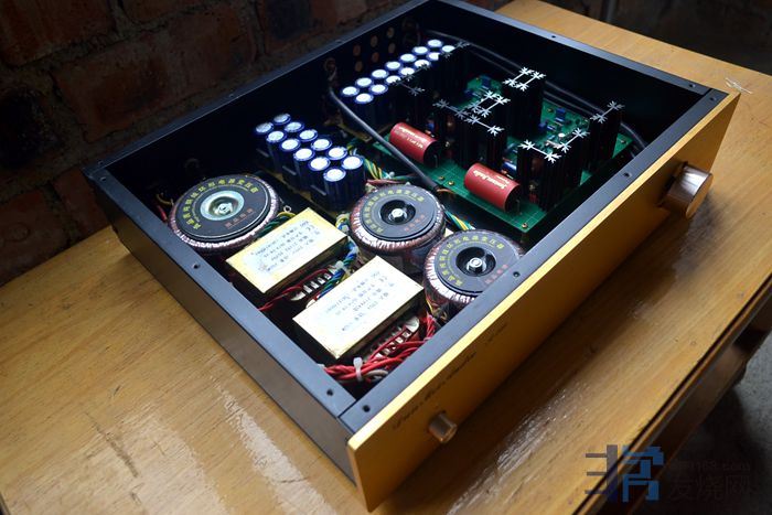 大量使用英国和弦包银线芯,信号线是镀银线,板上的音频跨线使用了几十元一米的纯银线。音量电位器为日本ALPS27型。变压器、功率管和阻容元件贴有超过60张的UFEEL高级音响实验室的合金贴(花费200多元),用于吸收杂乱电磁波和微震动。废除原机电源线,加装了一个尾插座,使用时请注意电源相位,可用电笔测出排插和功放的火线,把电源线对应插上。功放火线如果插到插排零线去,声音会变得单薄和冲。保险丝用的是瑞士舒特,是经过本人正反比对过的,和火零线一样,不要弄反。
