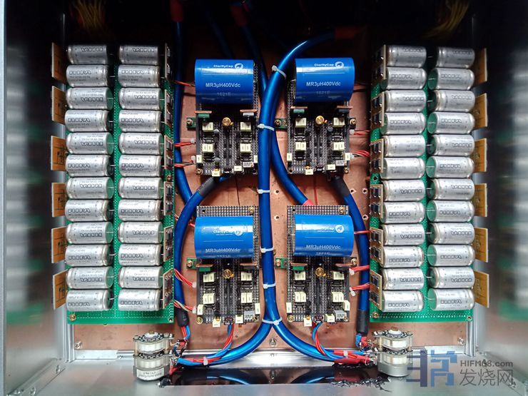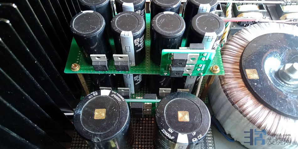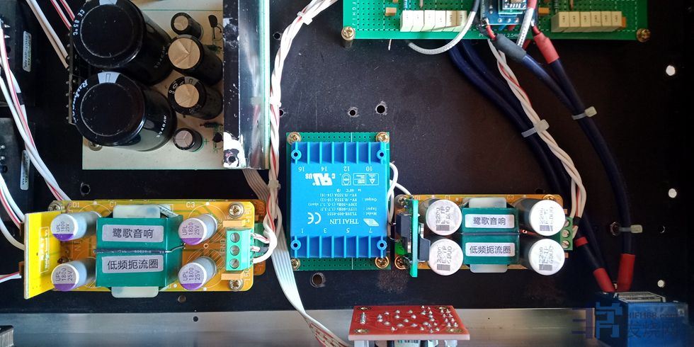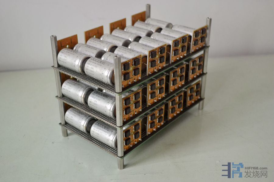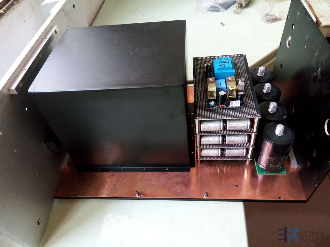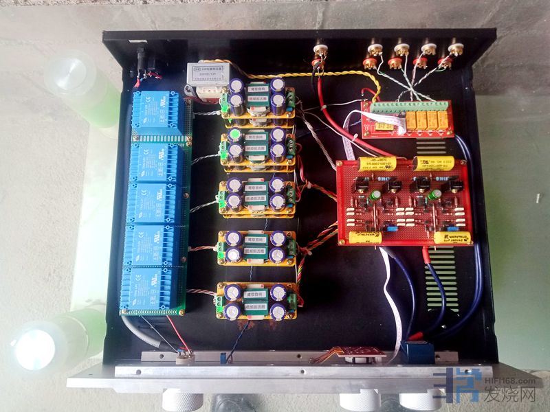 电压放大级的滤波电解松下3300uf50v8对,电流放大级用松下22000uf50v电解一对。因空间和成本限制,电压放大级没有采用稳压,优点是声音开放,缺点是线条感不如稳压。输入缓冲级用的是扼流圈即π型滤波电源板一块。