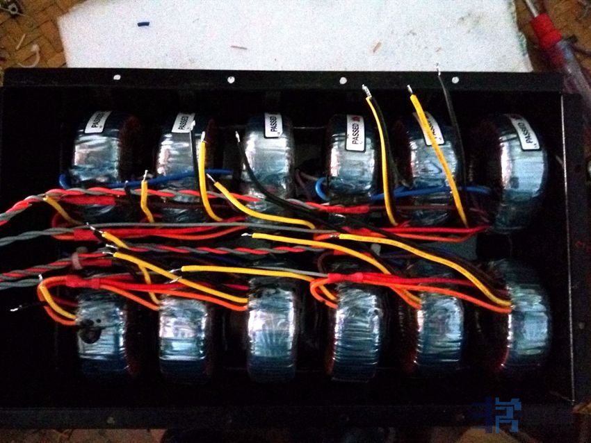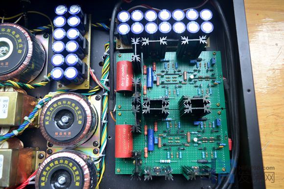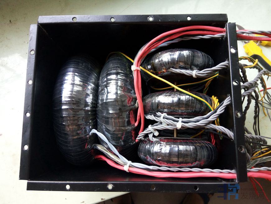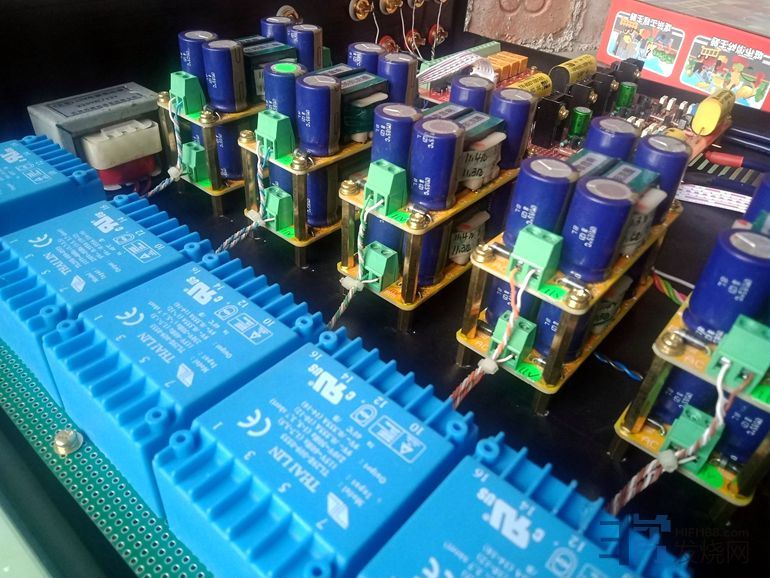 9个进口拆机EI型变压器,10W15v-0-15v,空置中心抽头,两个变压器次级串联形成30v-0-30v,大部分采用倍压整流,形成8组电源8路供电,供电压放大级部分。电流放大级也就是输出级供电为一个国产拆机300W环牛。