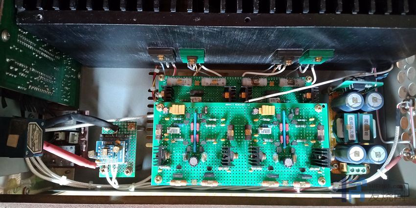 废旧利用之10变压器单9路供电全对称全电流放大合并式功放一台,功率2*70W。使用一个国产AV功放旧机箱和手头上淘汰、闲置的旧材料再补充一些全新材料装制而成。机箱有明显使用痕迹,前脸还行,盖板则有划痕和变形。显示屏保留通电,可以点亮,但没接放大板,所以灯光是静止的。