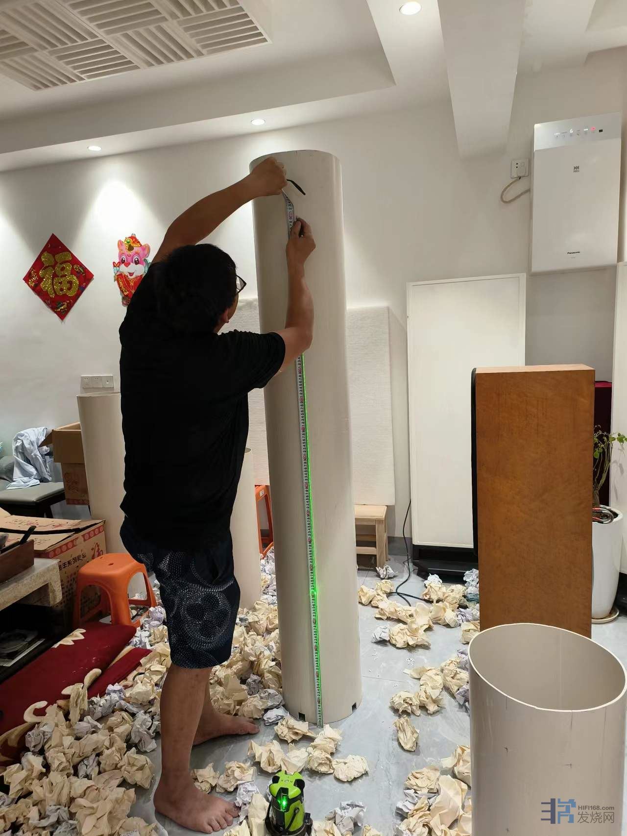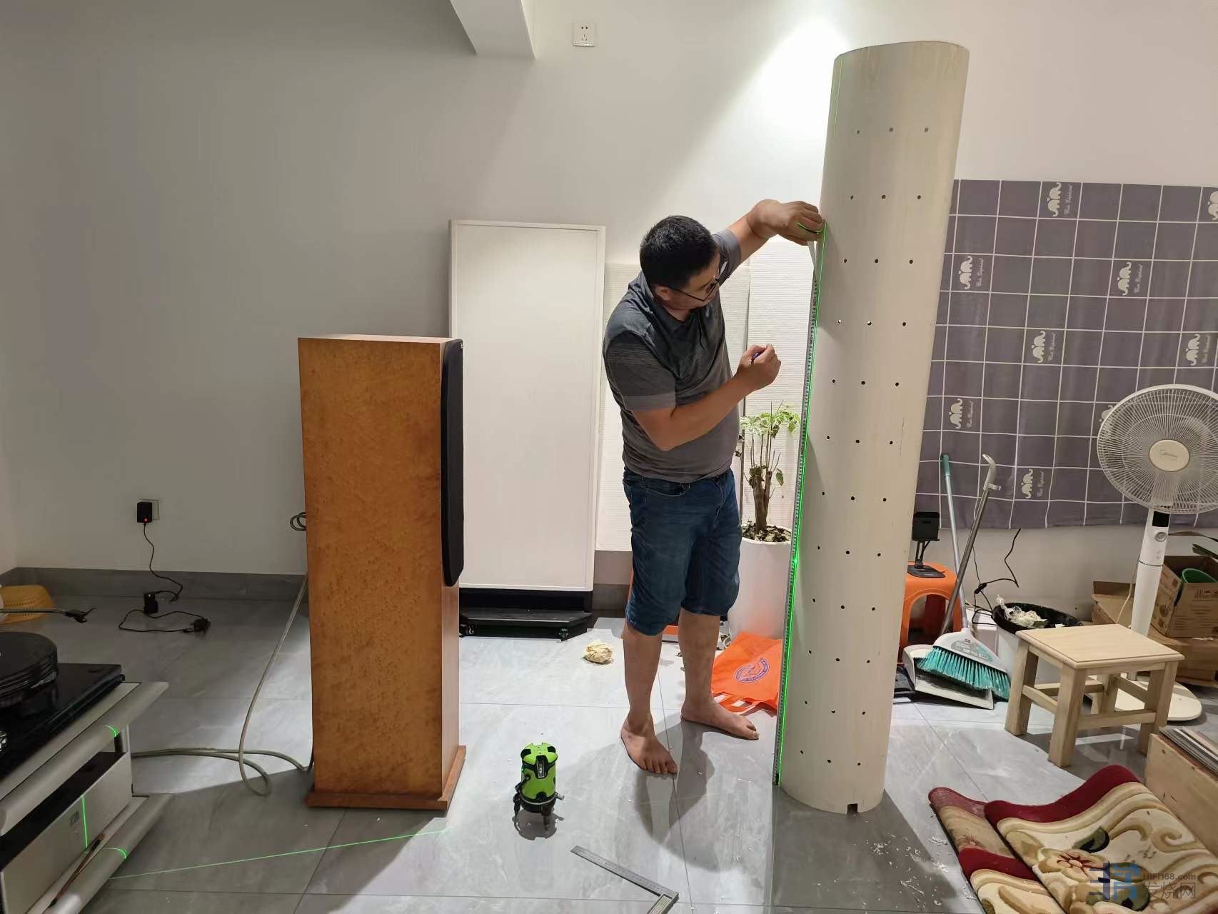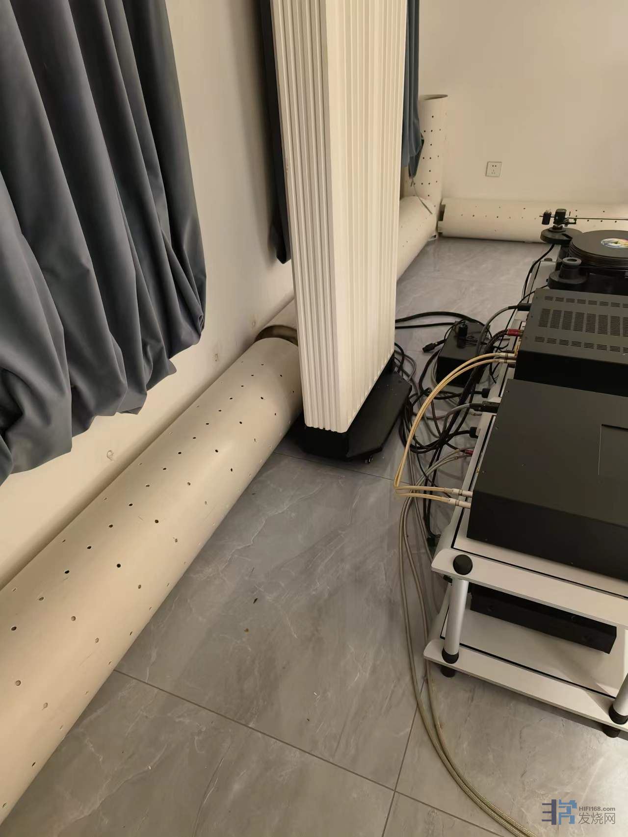 5、竖直放置的排水管,下部开槽,除了留出三个或者四个脚站稳之外,其余全部开槽,高度30~60mm,里面放一个厨房洗菜沥水用的多孔塑料篮子,把吸音棉抬高,离地顶起来,至少不低于开槽的高度,不让吸音棉在正立面露出来,可显著提高吸收低频的效率。我的体会是仅此一点提升音质的幅度不低于升级贵价线材。