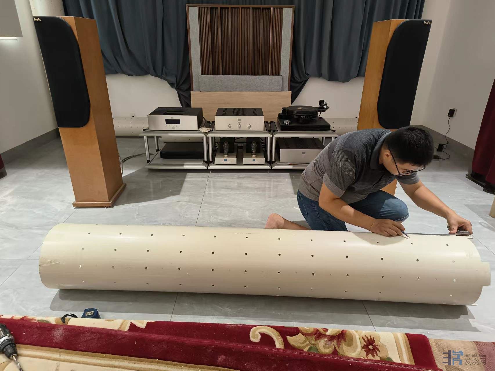 6、水平放置的管子似乎比竖直放置更有效率。另外,同等长度水平放置的管子每一根不需要太长,一米左右比两米更好,理由是,管子的两端比中间打孔的部分吸收低频更富有效率,管子越短端头越多……。