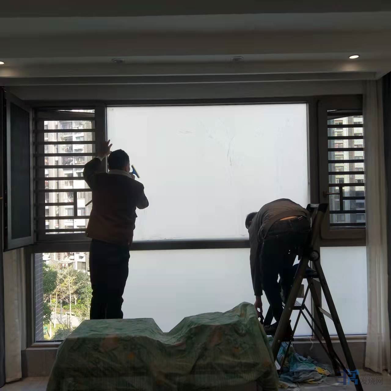 第一步:客厅落地窗包括窗扇全部贴上保护膜,3M白磨砂膜,这一款膜没遮光功能,没挡紫外线功能,没保温隔热的功能,这一切的功能都没有,我只有一个要求:遮挡视线,双向遮挡隐 私!同时耐久。客厅里面无论怎样折腾,闹得天翻地覆都不让人在看见,眼不见为干净!我也不希望有碍于观瞻,影响整栋楼的建筑形象。