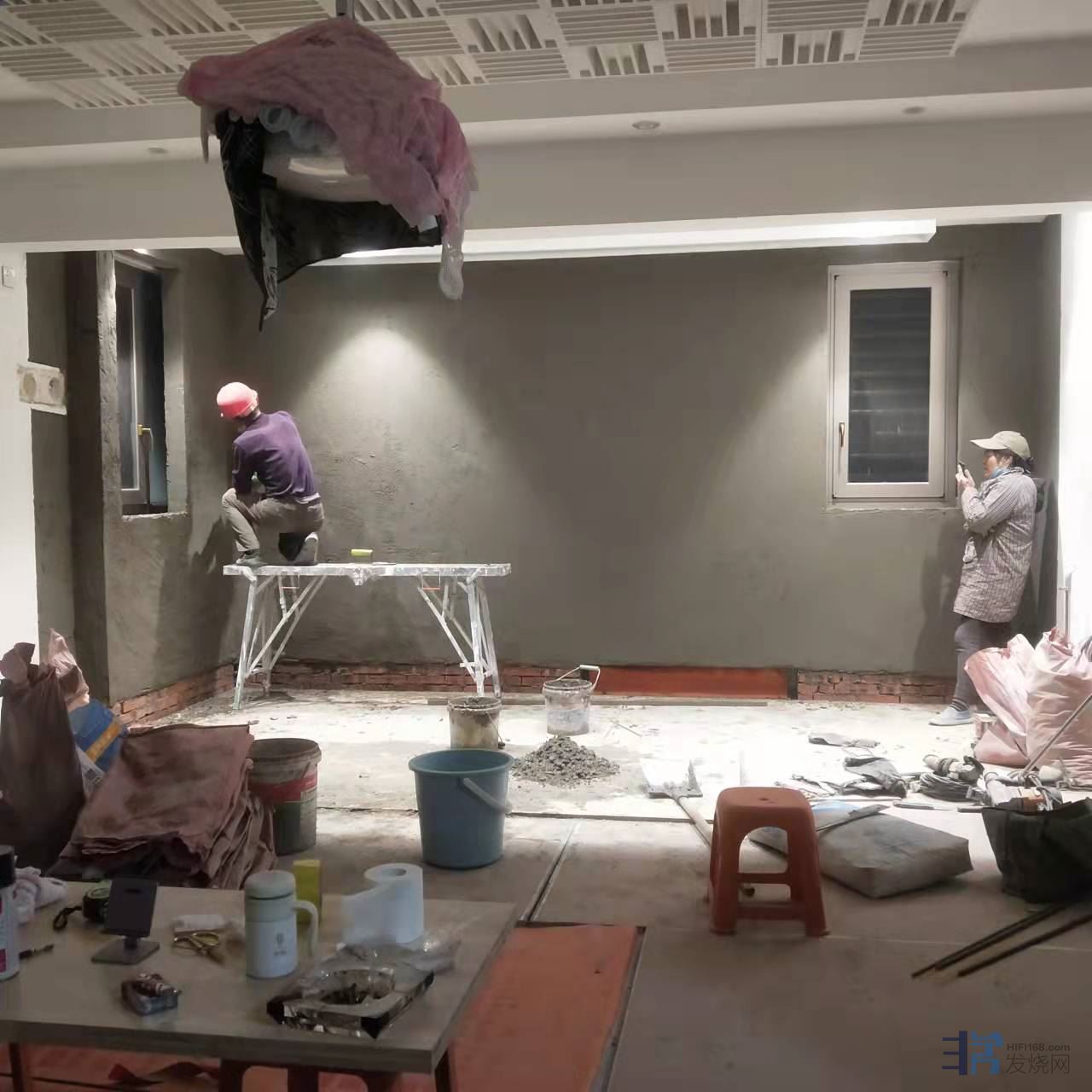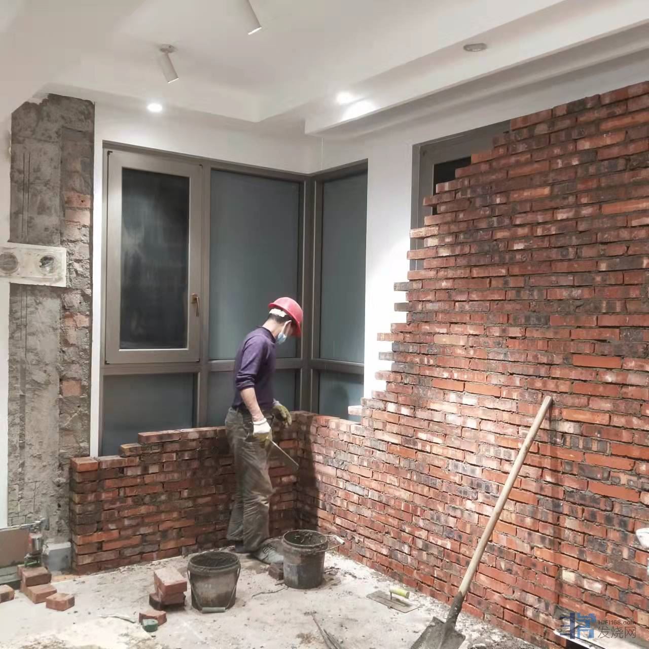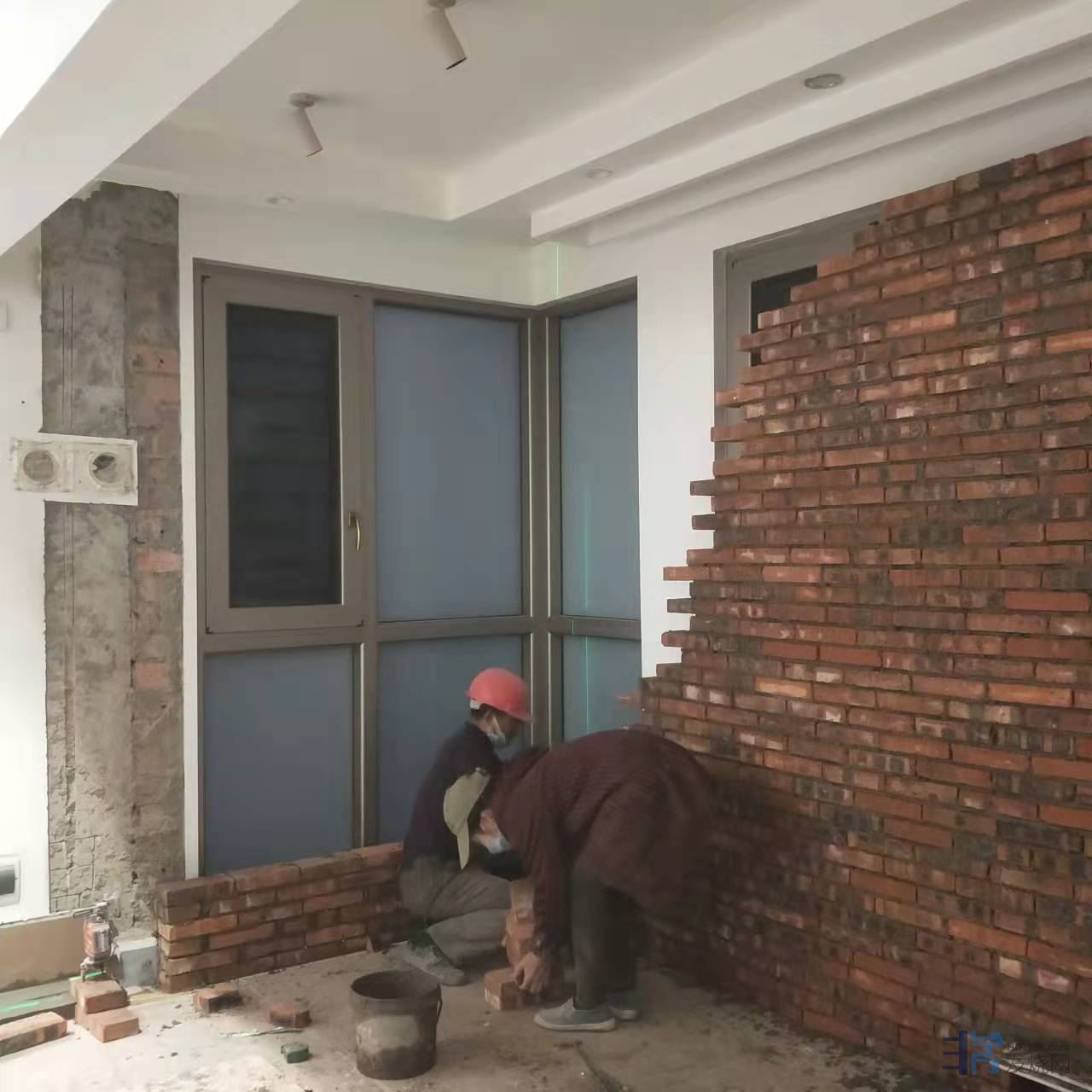 第三步,也是最重要的一步,砖墙伺候!在里面砌砖砖墙,把落地窗封起来,包括相应的墙面抹灰、硅藻泥、踢脚线等等。