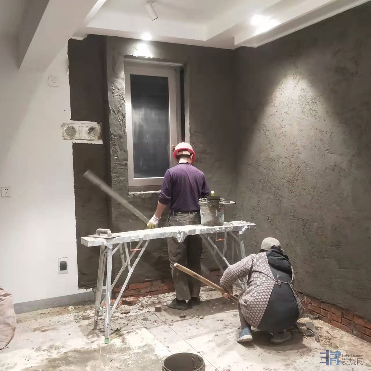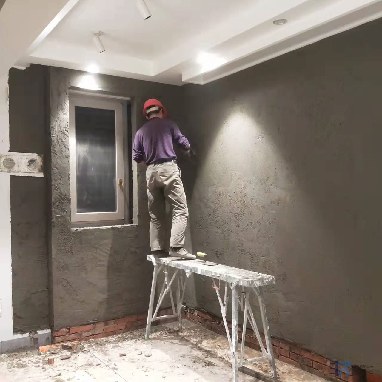 第三步也是最重要的一步,砖墙伺候!在里面砌砖砖墙,把落地窗封起来,包括相应的墙面抹灰、硅藻泥、踢脚线等等。