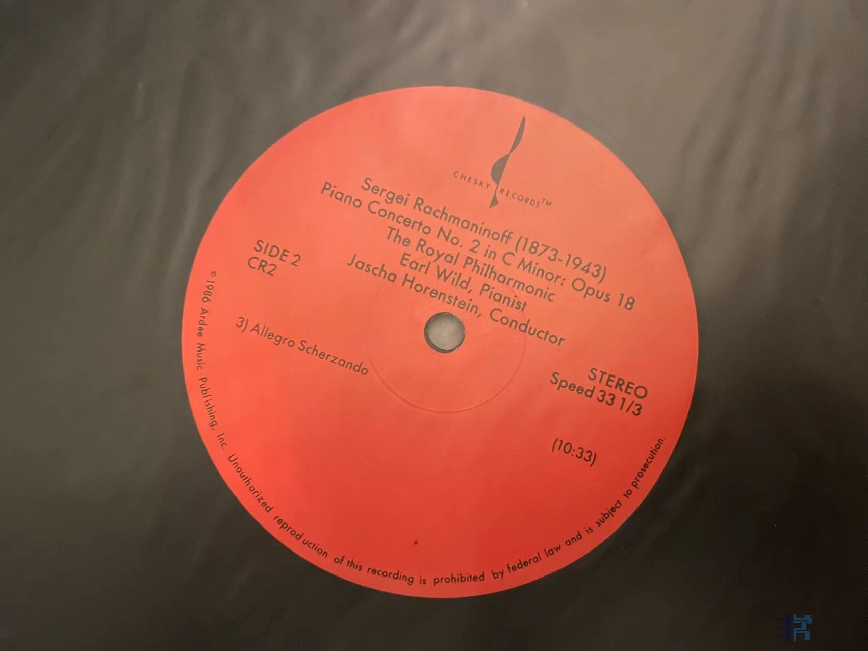 怀尔德(Wild)演奏拉赫玛尼诺夫钢琴协奏曲第二号,Chesky发烧转录,很好的录音转制,怀尔德的拉赫值得一听,唱片新净,但有几个喷溅点如图,无法清除,实际播放未发现明显影响,成色NM-。300元(已出)