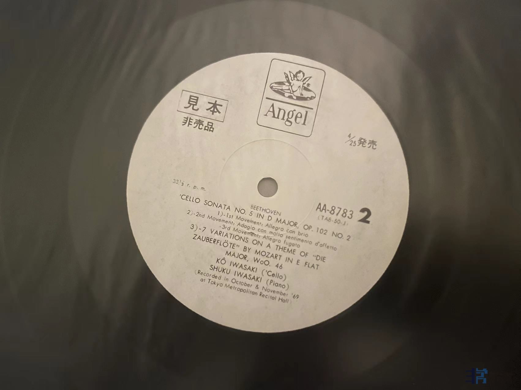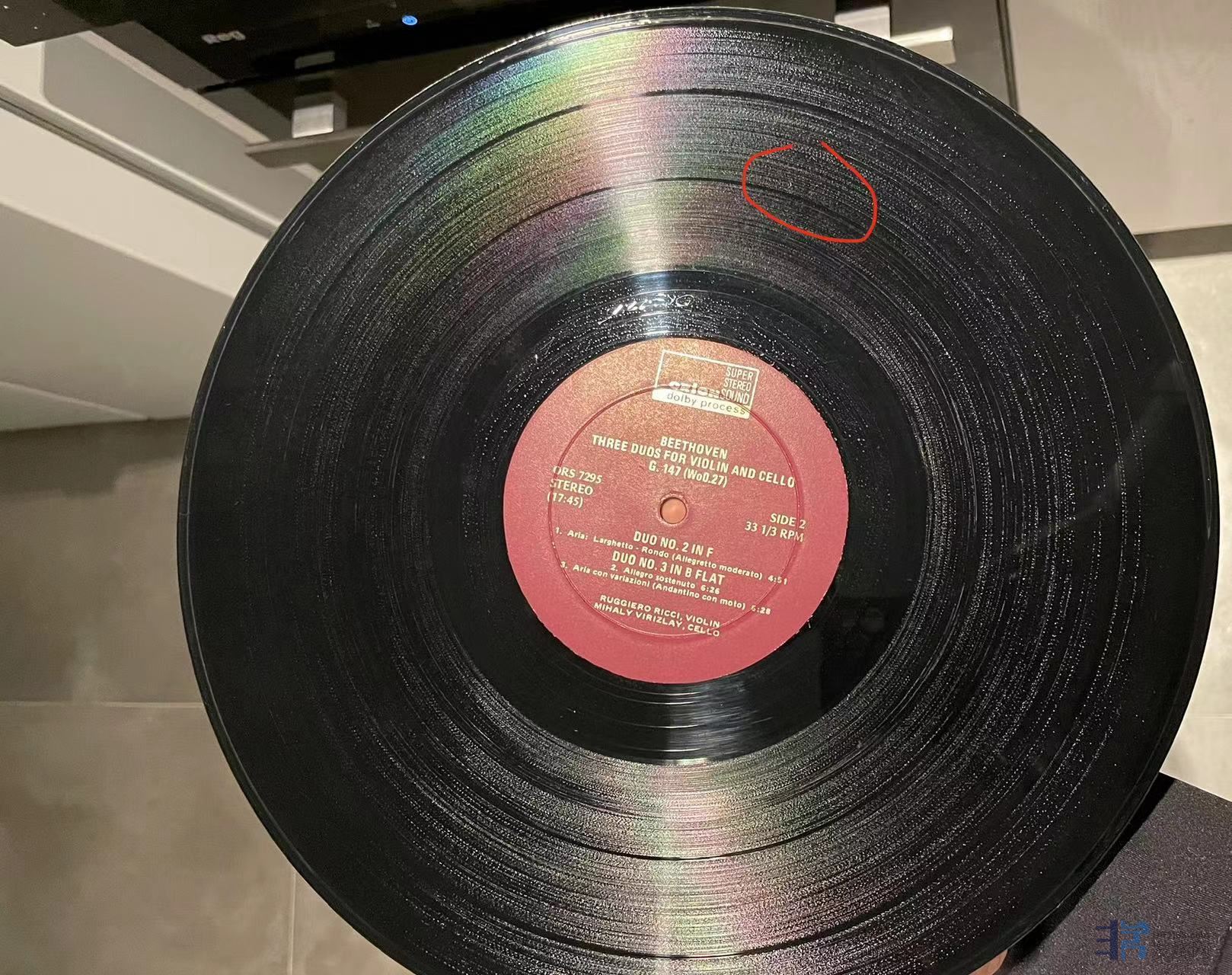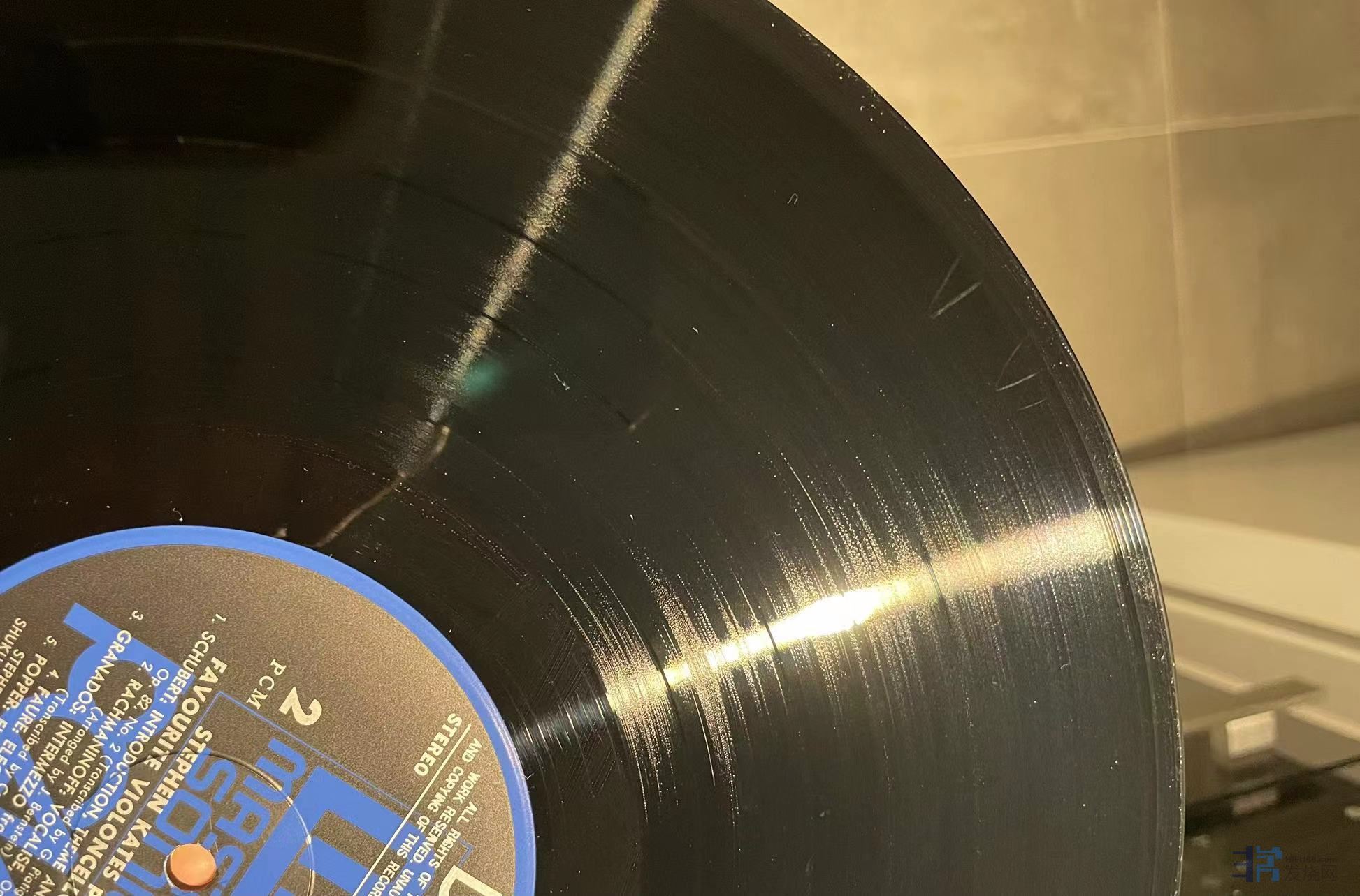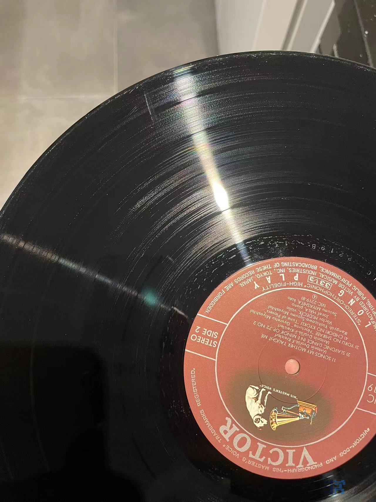 凯特(Kates)与岩崎淑(Shuku Iwasaki)合作演绎的大提琴小品集,天龙日首版,唱片一面成色完好,一面有轻微印子如图,应该是上一任藏家失手指甲划痕,实际播放尚好,成色NM/EX-。120元(已出)