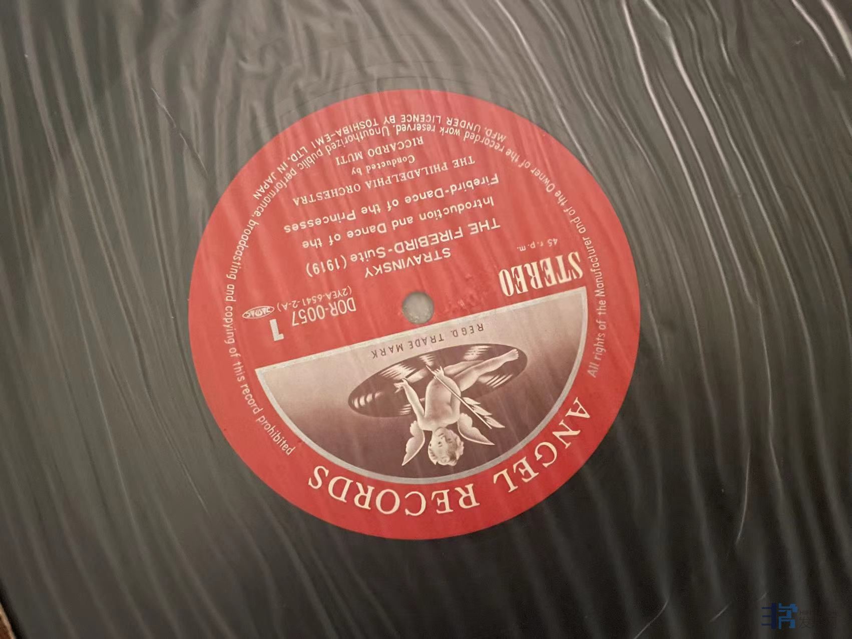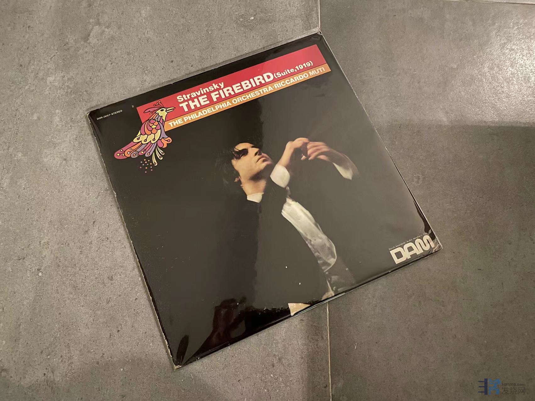 斯特拉文斯基火鸟组曲(Firebird Suite),穆蒂(Muti)指挥,日版DAM45转超级发烧录音转制,非常棒的转制,音响效果非常好,有一些细痕和袋印,和一个弱痕如图,成色EX+。180
