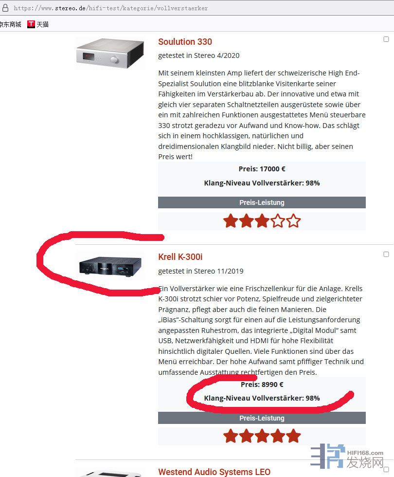 KRELL当家合并机,价格近9000欧元,推力强劲,我用来配搭意力小旗舰S507。 该机带数播,内置DAC解码,支持ROON,TIDAL等,支持蓝牙,USB硬盘,性价比很高,德国立体声,美国立体声,英国WHATHIFI等各大欧美媒体一致给予好评。德国权威立体声stereo.de给了98分且全五星好评! 整体评分与价格17000元的登峰330同分。