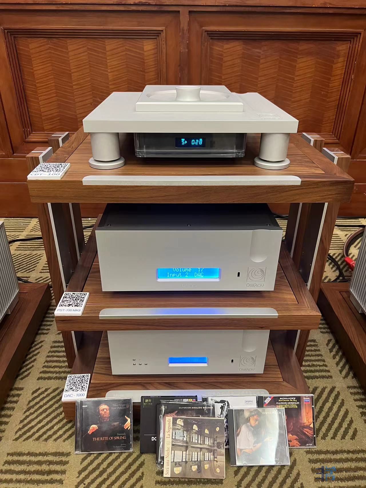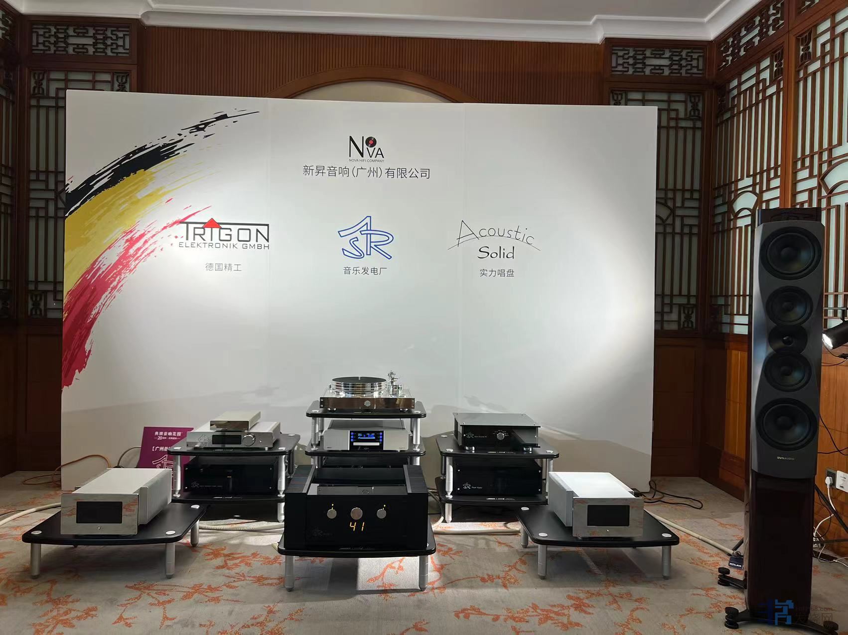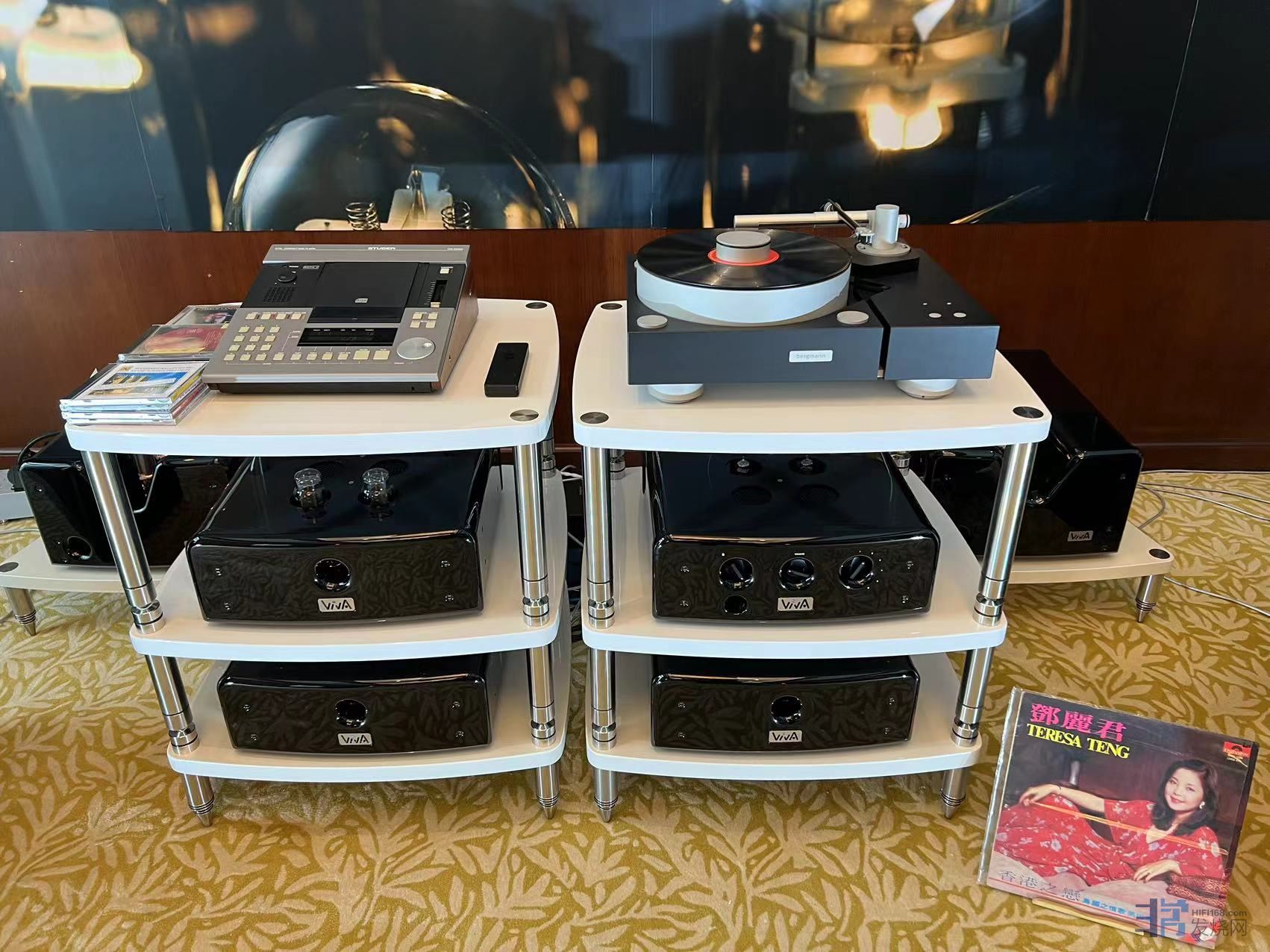 展房中的另一套系统是意大利VIVA推出的全套胆前后级组合驱动自家号角箱,这套系统表现出了充足的能量感和饱满热烈的声音风格。虽然在有限的空间内,号角音箱的“零振效应”还是偶尔会出现,但其声音基底表现称的上是一套出色的号角系统。