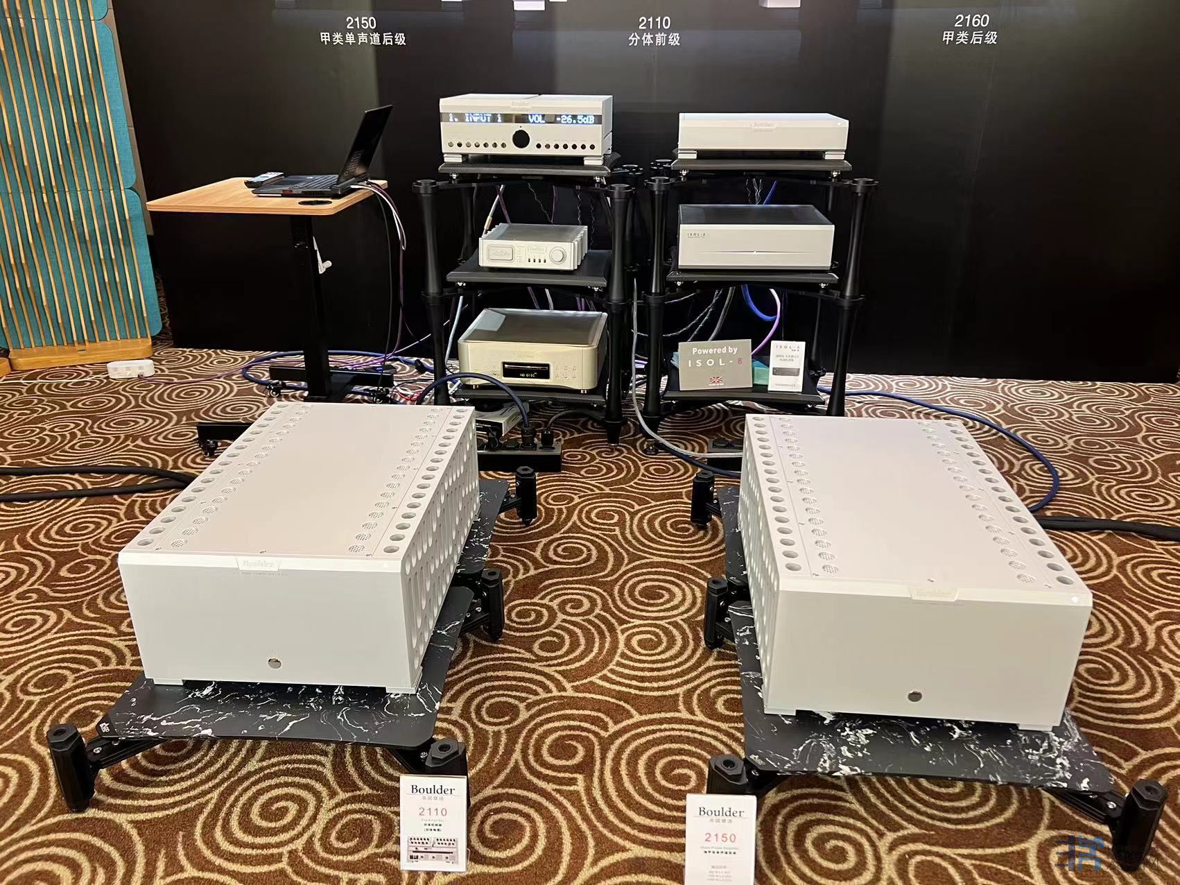 丹拿信心60落地箱。作为新一代信心系列的代表性拳头产品,到底怎样的hiend级功放会适配于它,甚至扬长避短的挖掘出它潜力的,我也一直在观察总结。此次展会上有两个展房用到了这对音箱,一个是用德国老牌音响品牌ASR大合并功放驱动,另一间则是用我非常喜欢的美国品牌boulder2110+2150前后级搭配。简单的说:两套系统搭配信心60的效果都是不尽如人意的。但两套系统又有本质的区别。一套是推不动,一套是不适配。ASR根本无法良好驱动信心60,表现在低频拖慢,形体感缺失,中高频扎实饱满度欠奉。而boulder系统的情况则不同,能量感非常的充沛澎湃,全频饱满度很高。但很遗憾的是,丹拿信心系列独有的极为流畅丝滑,带有淡淡光泽感的高频音色和质感被很大程度上削弱了,高频显得有些直率僵化,缺乏婉转动人的乐感表现。这套boulder前后级系统我曾在Eggleston Andrea和B&W802D3上听到过极为出色的,富有肌肉弹性的圆融声音,在westlake号角上声音也是大气雄浑,可惜此次在丹拿信心60上并没有开疆拓土,随算不上折戟沉沙但也只能是流于草莽。由此可见音响的个性差异是多么的巨大。所以也请那些初烧小白再不要听信所谓“百搭”之言了。没有真正的百搭,只有适口的对味!