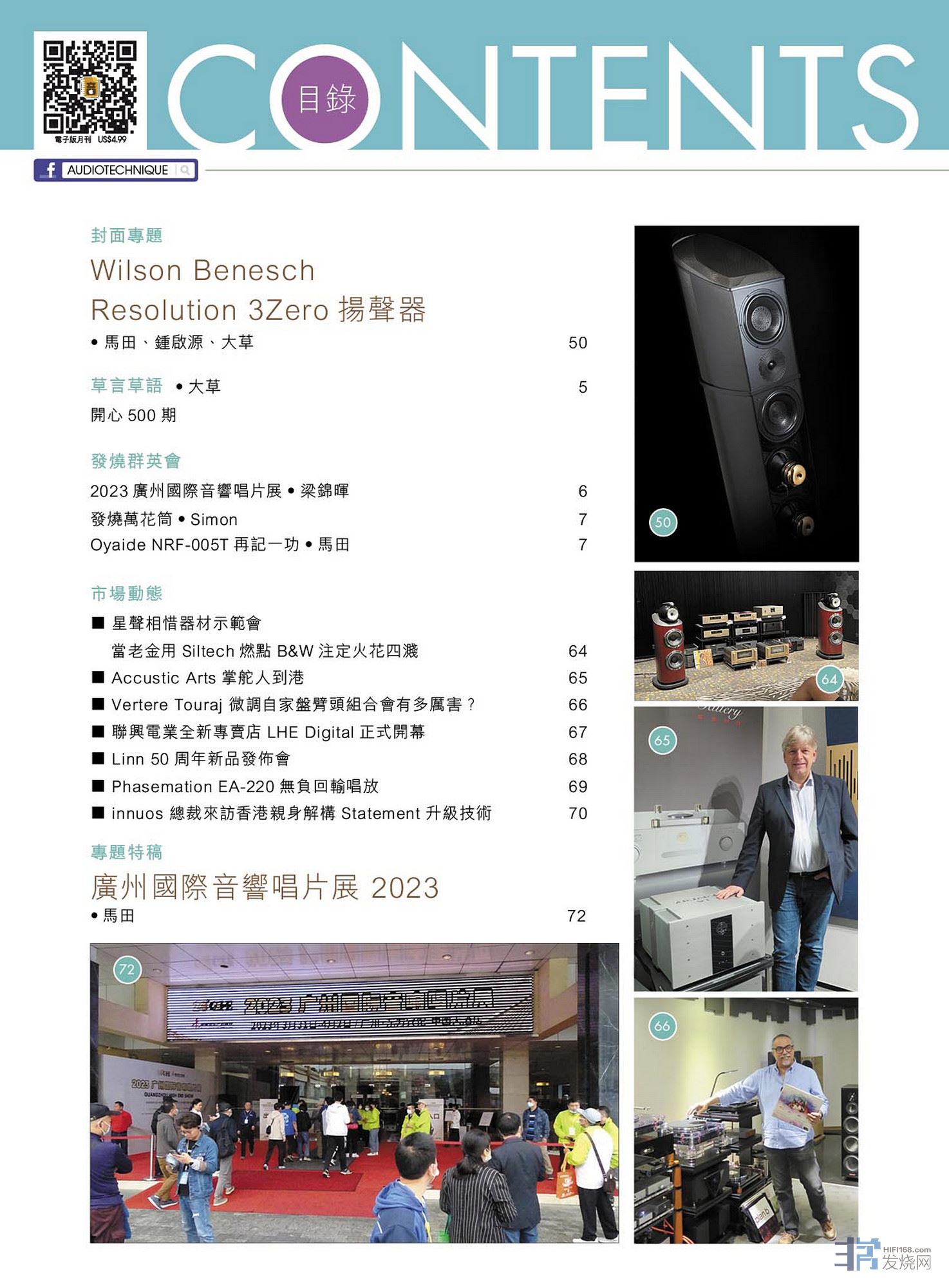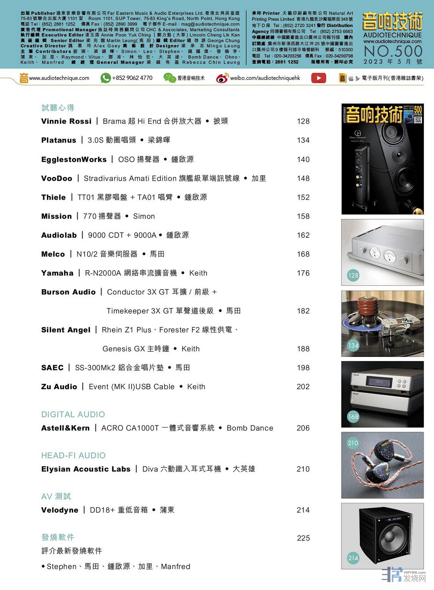 Vinnie Rossi Brama超Hi End合并放大器、Platanus 3.0S动圈唱头、EgglestonWorks OSO扬声器、VooDoo Stradivarius Amati Edition旗舰级单端讯号线 、Thiele TT01黑胶唱盘 + TA01唱臂、Mission 770扬声器、Audiolab 9000 CDT + 9000A、Melco N10/2音乐服务器、Yamaha R-N2000A 网络串流扩音机、Burson Audio Conductor 3X GT 耳扩 / 前级 + Timekeeper 3X GT 单声道后级、Silent Angel Rhein Z1 Plus、Forester F2线性供电、Genesis GX主时钟、SAEC SS-300Mk2 铝合金唱片垫、Zu Audio Event (MK II)USB Cable、Astell&Kern ACRO CA1000T 一体式音响系统、Elysian Acoustic Labs Diva六动铁入耳式耳机、Velodyne DD18+ 重低音箱。详细内容请参阅目录。