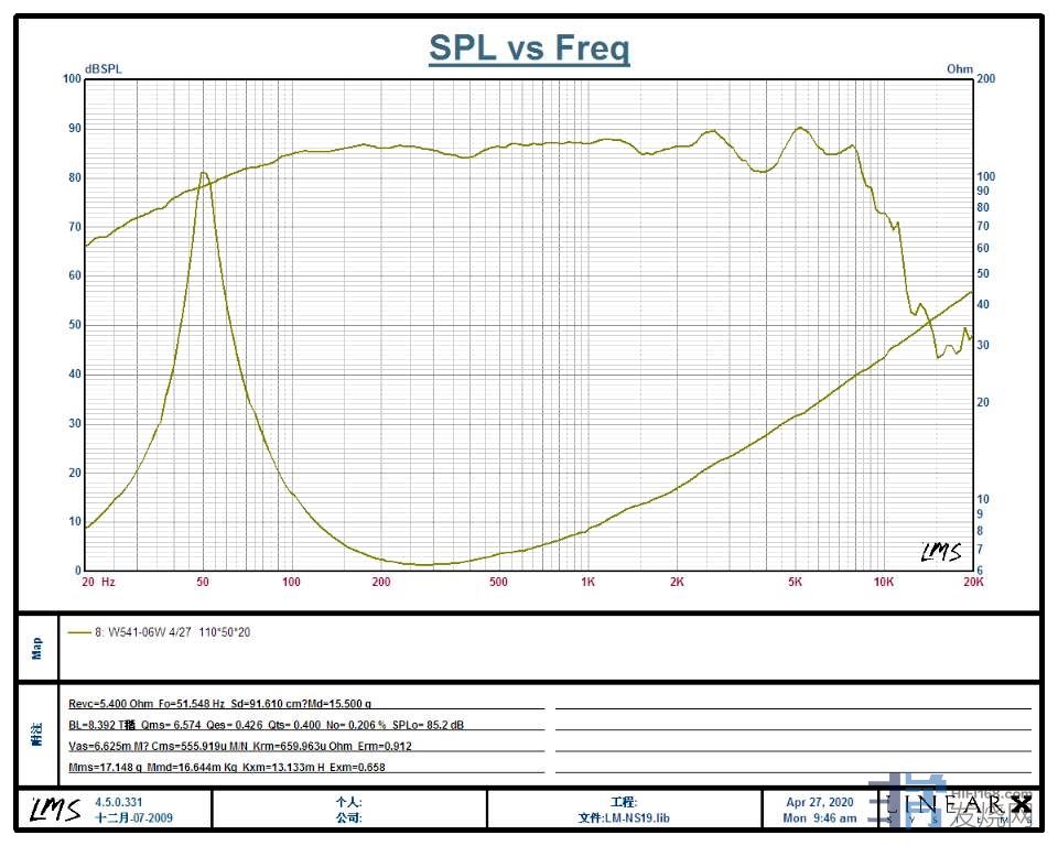 但是,因为这个凹陷的存在,做为二分频音箱的低音单元就非常合适了。这是一个天然的分频点,因此,自己用它做了NS15出来。用两阶分频的方式就解决了问题,而且听感上中高频非常流畅,几乎感受不到分频器的影响。感谢这个凹陷!
