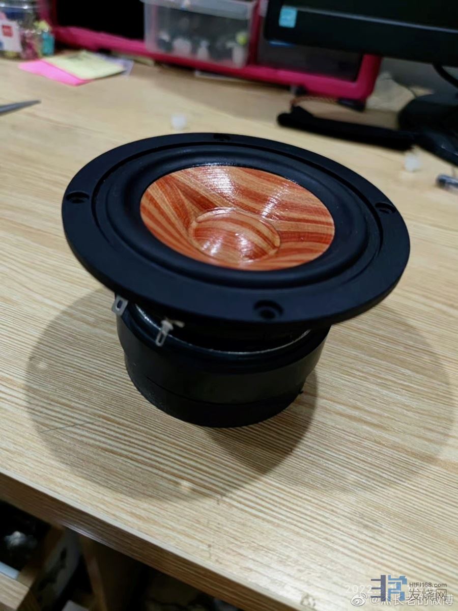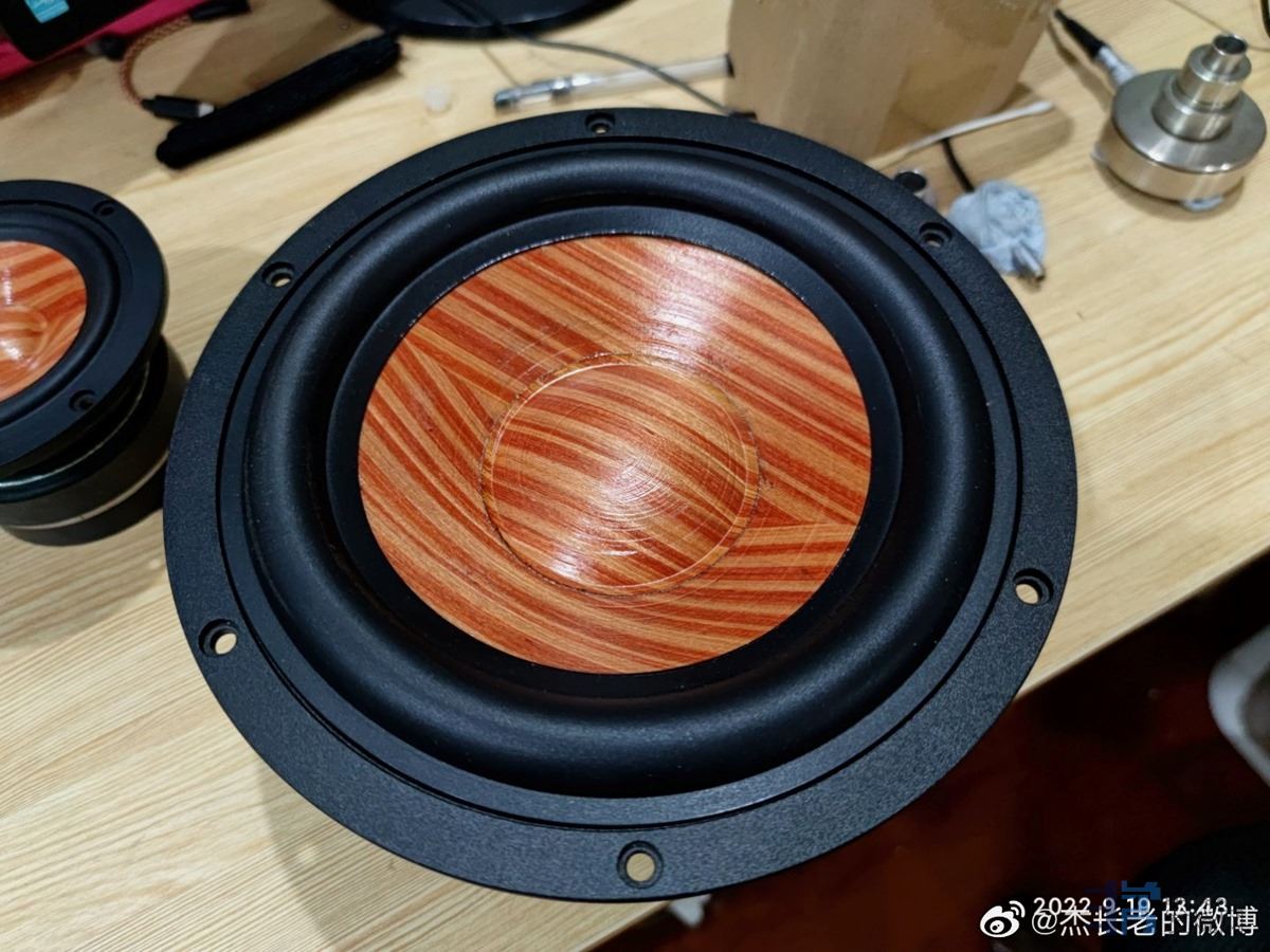 中音的选择花的时间最长,从协调的角度上讲,自然是5寸的单元和8寸的更协调。所以,一开始自己也准备用5.5寸的实木盆。为了确定它的中频满足要求,自己专门做了样品来测试。结果发现它的中频响应在2.5K Hz处有一个比较大的凹陷,大约有10db水平了。很显然,它满足不了自己的需求,因为我需要把分频点调到3500-4000Hz这个水平。
