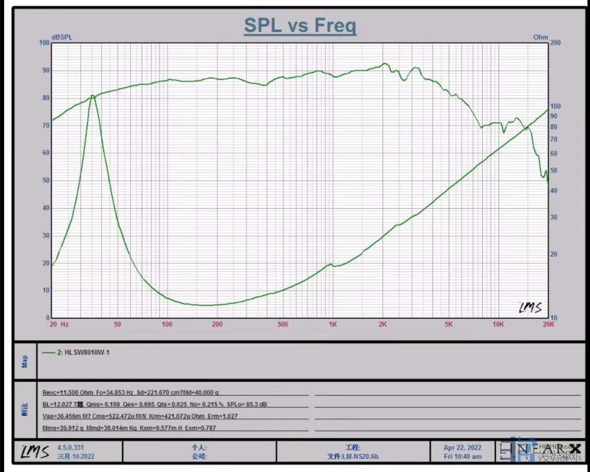 在接上分频器后,我们初步测试了音箱的参数。然后,我就傻眼了。是真傻眼,都不太敢相信自己的眼睛。我赶紧向合伙人确认,不过,他很自信,以前我们做箱子他也测过好多了,中高频和消音室都没有什么区别。只有低频他没把握,这个只有标准消音室测得更准确一些。不过,我反而不在乎,低频真的不能看频响曲线,听感这个时候更重要一点点。初步测试的结果让人十分满意,频率响应大家自己看吧。一格1db的精度。
