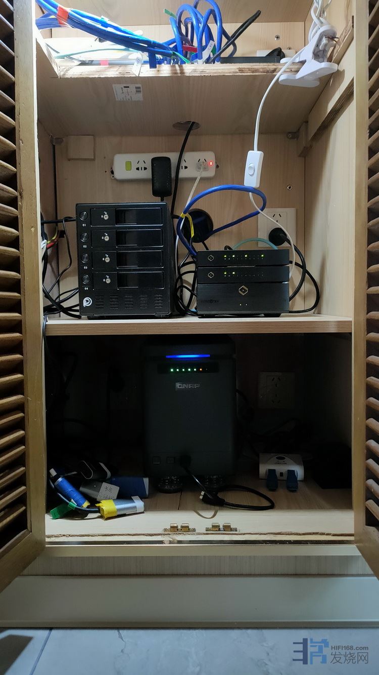 装修时,邻内过道一侧,在主卧室衣帽间划出一个小空间,做的网络设备中心,最上层是光猫+18口换机,第二层是硬盘柜+Silent Angel仙籁N8网络交换机两台串联(搭配同厂线电),最下面一层是威联通NAS,内插4x18T硬盘,硬盘阵列后组建48T的家庭无损音乐资源库,目前已经拷贝了接近27T的资源入库,为新房的两台数播提供充分的无损音乐资源,估计200年内24小时连续播放不会重复一首曲子