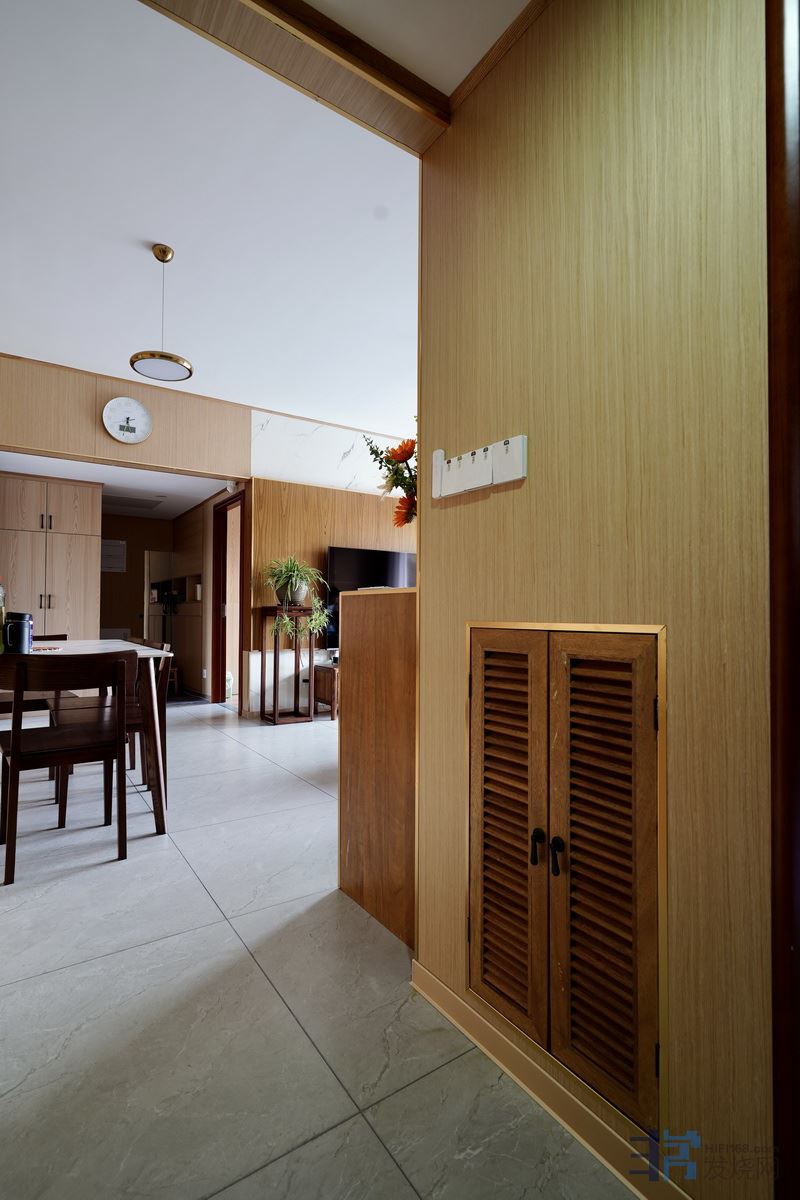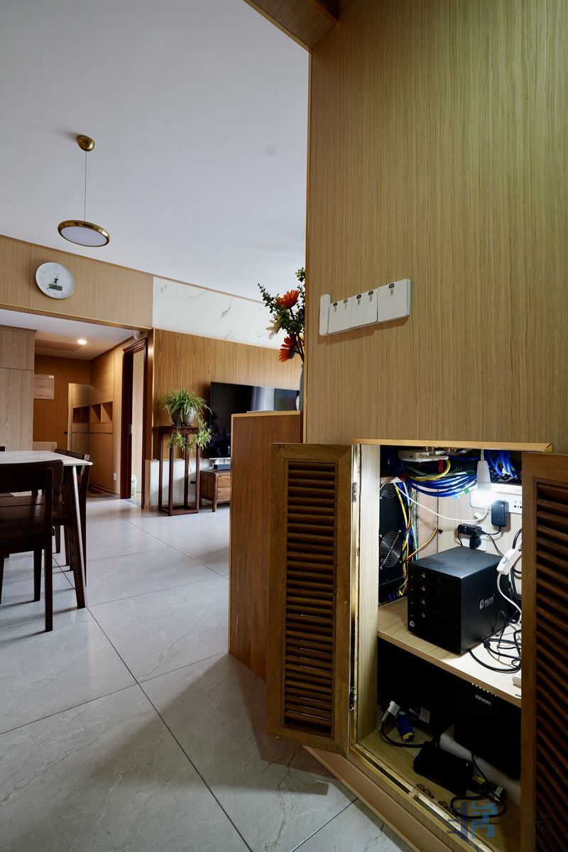 这就是内过道靠衣帽间一侧的网络设备中心的百页门扇开启与关闭状态,顺便说一下,左转90度客厅另一侧也有一扇固定百页窗,我自己设计的尺寸,用榄仁实木找本地一家加工制作的,采用百页门窗扇,方便对流和散热,靠固定的百页窗内侧,还安装了一个温控抽风设备,内部温度设定达到35度就自动进入抽风散热模式。