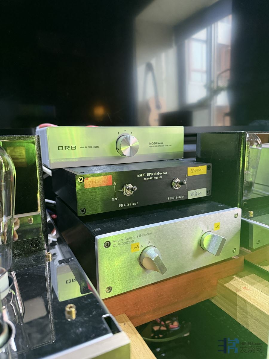 ,这次又增加中间那一台黑色的功放至音箱的切换器(三进一出),每次听音乐,确定开哪台功放,扭动几个开关,就可切换至相应的音源及箱子,无需再在后面频繁地插拔线材,方便的真是不要不要滴
