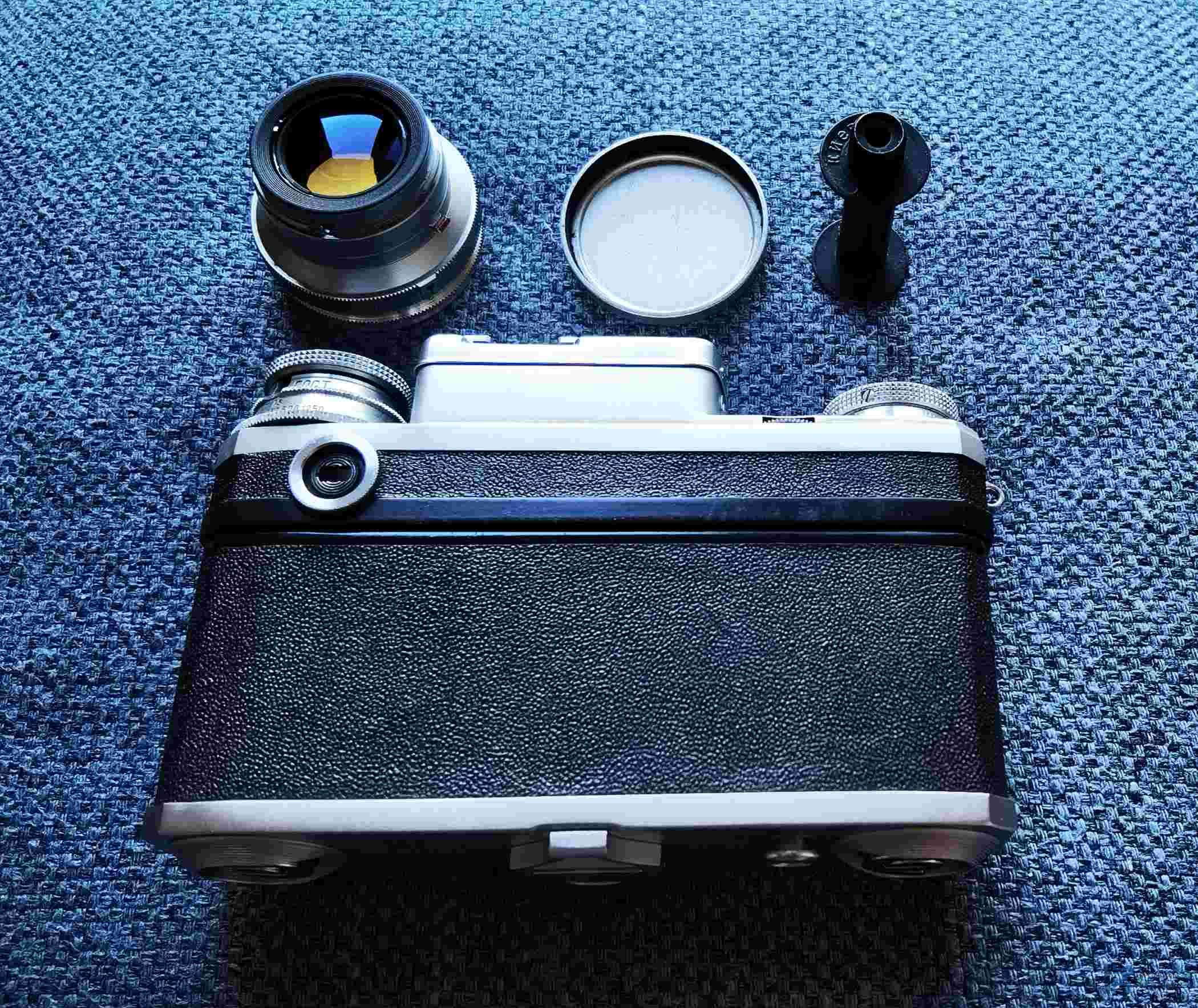 本机产于1953年,机顶A编号,稀有早期蔡司生产线产品,几乎跟康太时一样,是对战前的“CONTAX"(康太时) 照相机的原版仿制,机身及镜头全新或近全新,机身漆面几乎完好,几乎无使用痕迹,镜头甚净,在强光照射下可见微尘,实属难得。除机身及镜头外,尚有:好品原厂机套及机带,全新或近全新原厂金属片轴(带厂标),全新或近全新原厂镜头盖,说明书。
