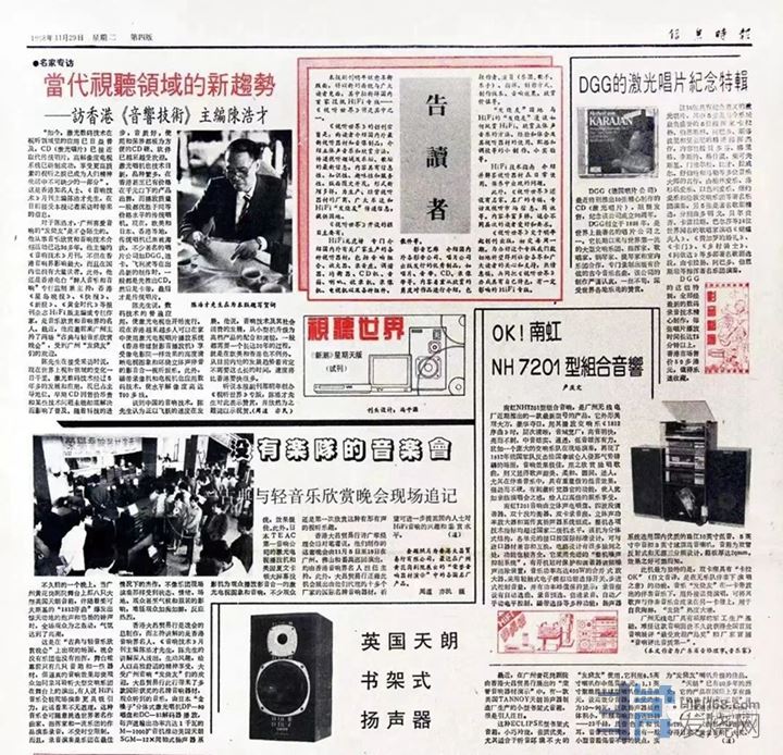 真正掀起广州音响热潮的是一张小小的报纸——《信息时报》Hi-Fi版。这个专版创办时每星期天出一次,由编辑周道先生和几位发烧圈中的老大哥系统地介绍音响器材、音响知识以及软件欣赏。各种文章通俗易懂、生动有趣,开始为广州人撩起发烧音响那神奇的面纱,而通过“土炮大赛”等系列活动使其产生越来越大的影响力。1992年是《信息时报》Hi-Fi版迈向新纪元的一年。这年Hi-Fi版不仅在上海等地成立分印点,而且还在《信息时报》众多专版中首出彩色版,逐步成为国内音响文化推广的核心。