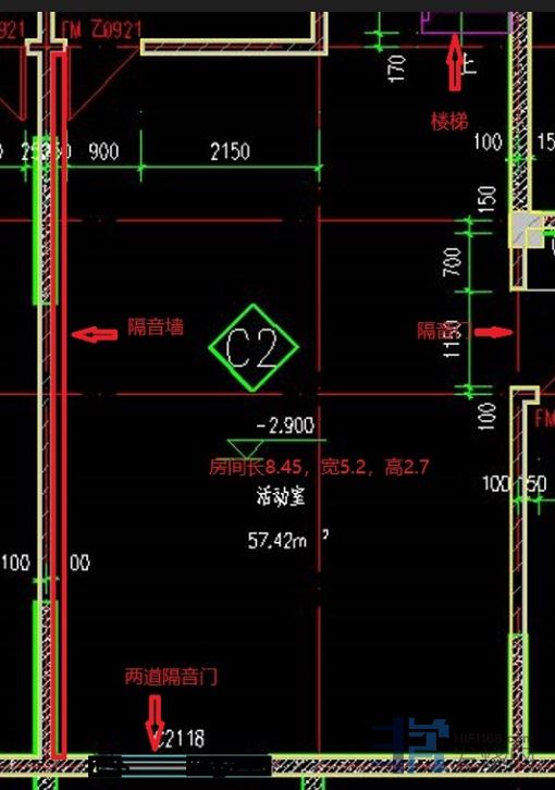 左边与邻居共用墙,已经做了隔音,影音室不用考虑隔音。幕布放下边方向,左下角是通风井,放两扇隔音门,右边放一扇隔音门,请教其它墙面装修方案,谢谢!