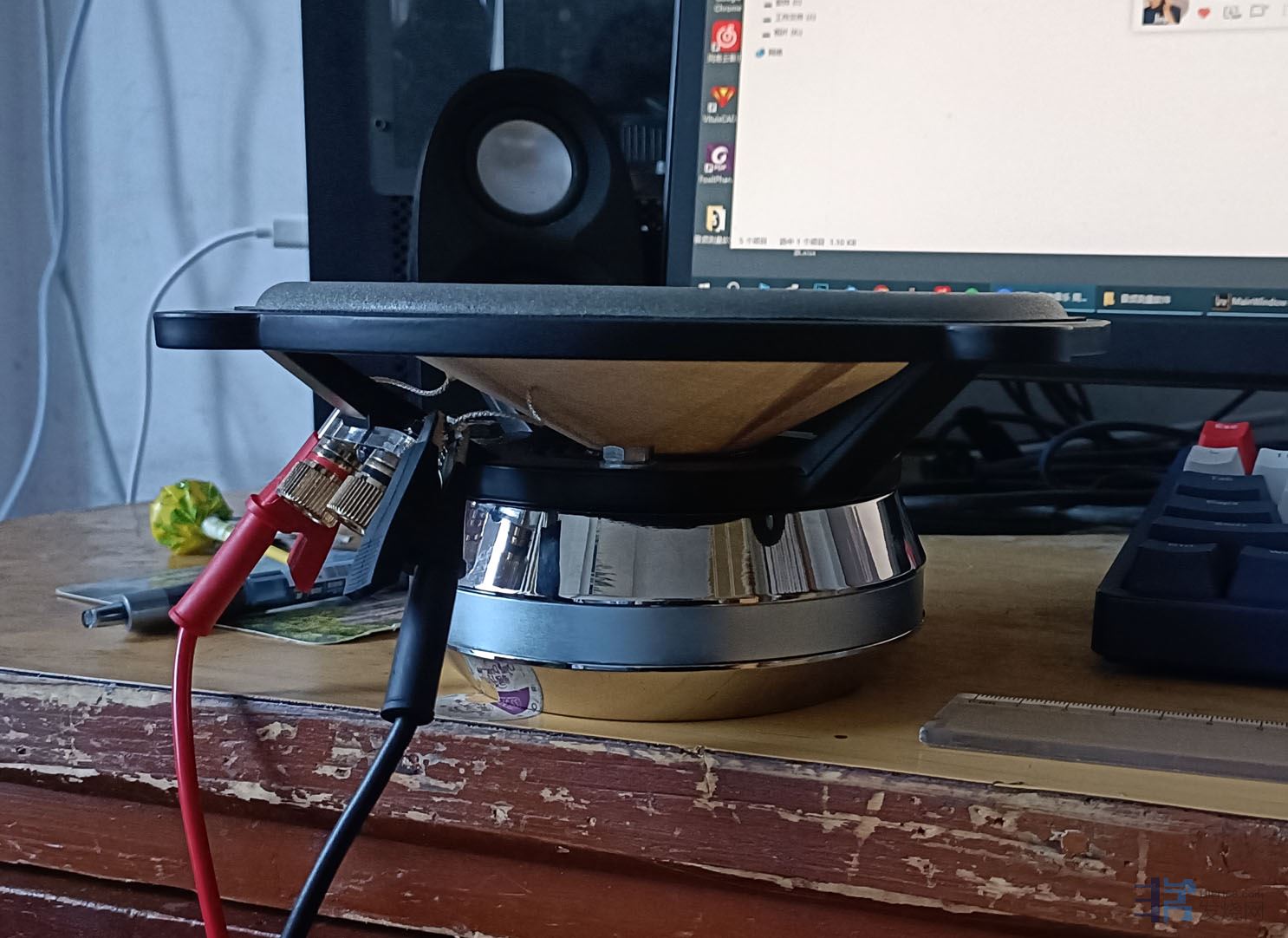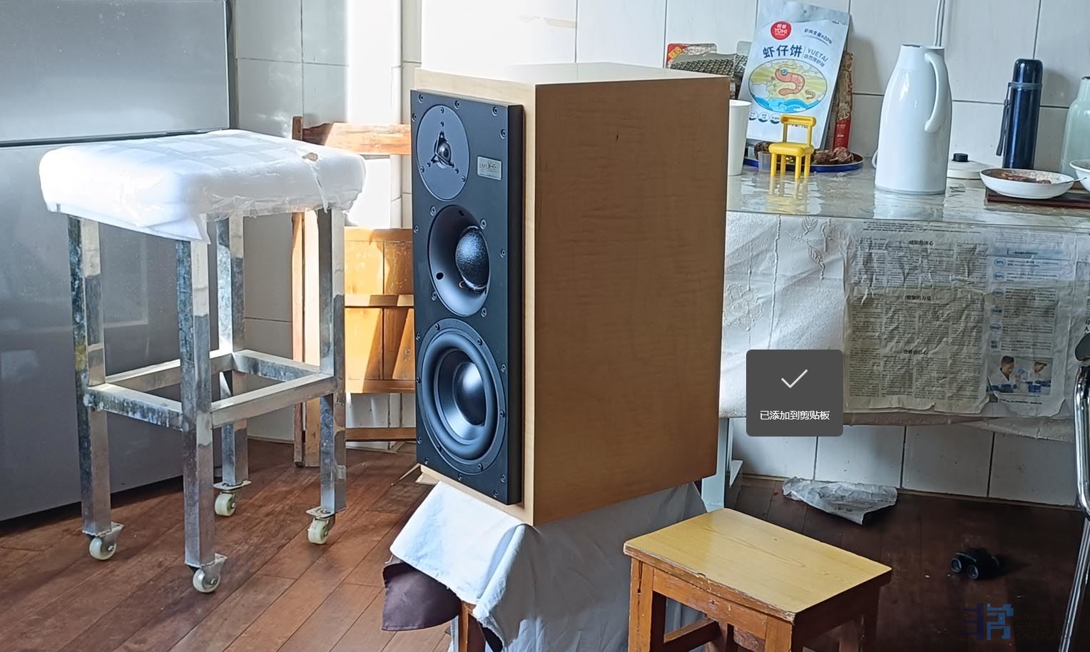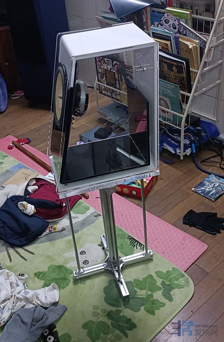 装配好以后的样子,但这个音箱指向性设计的缘故,不适合横摆,当时只是没有适合的脚架