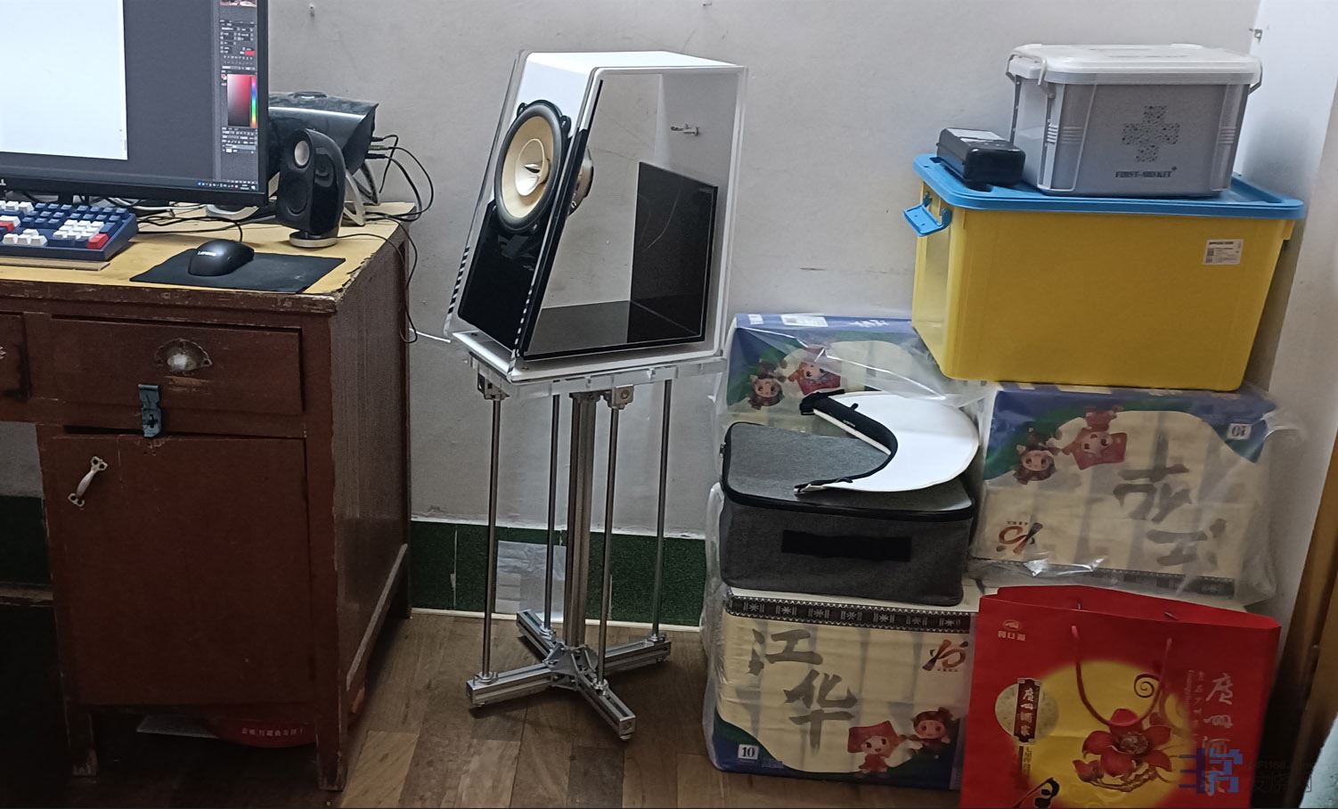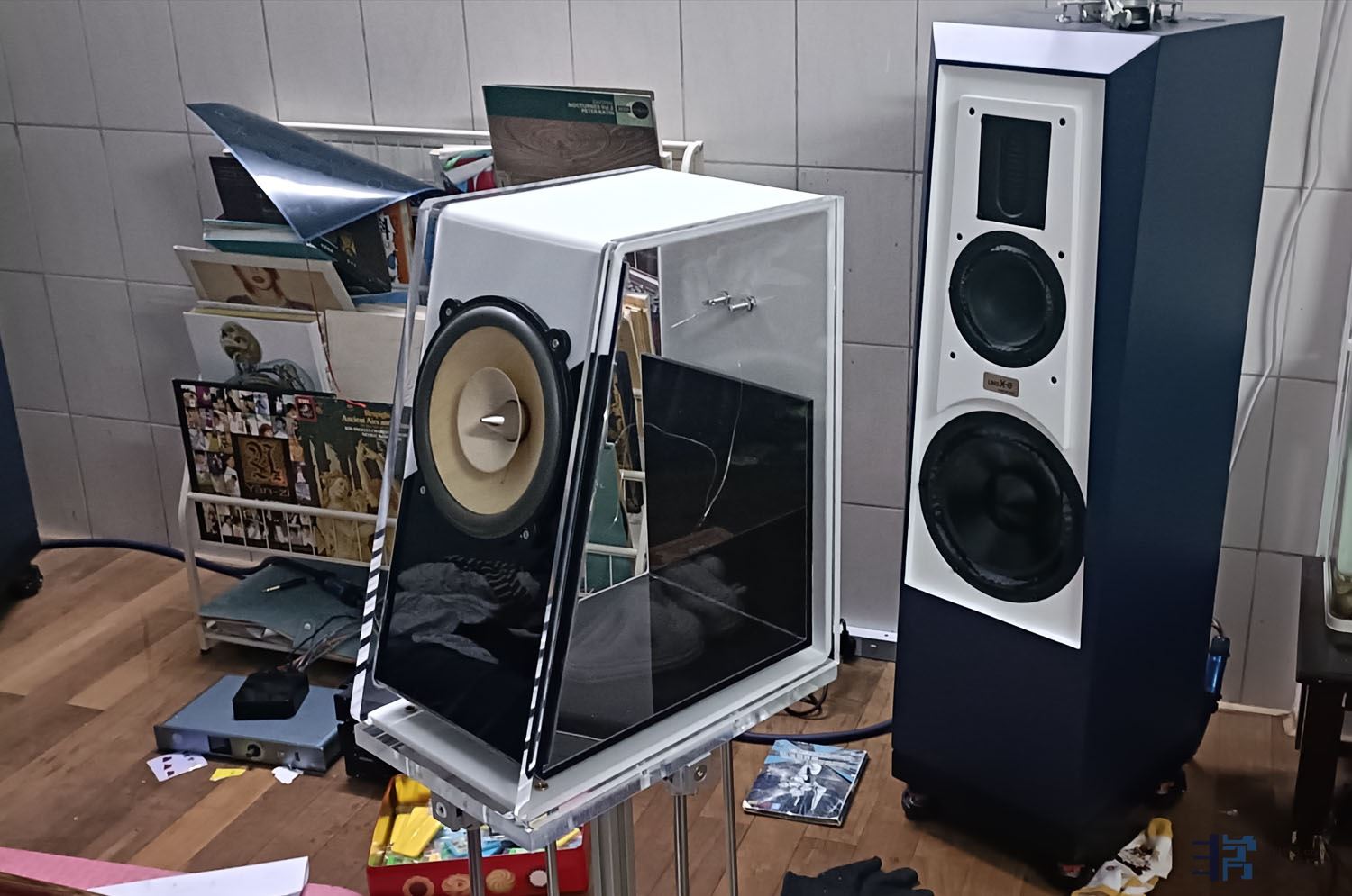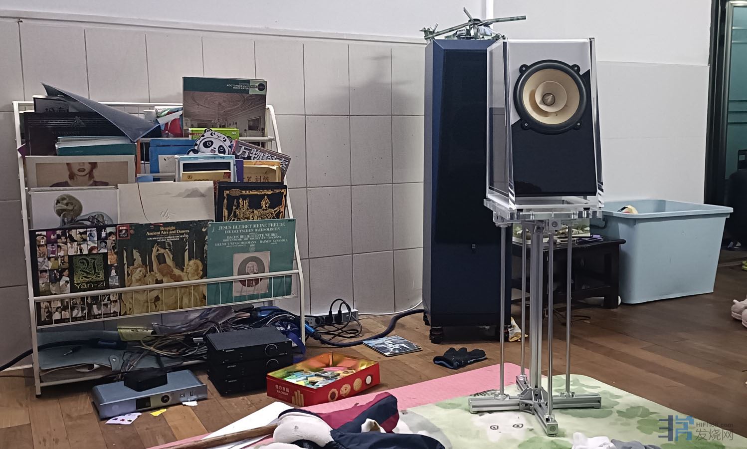 装配好以后的样子,但这个音箱指向性设计的缘故,不适合横摆,当时只是没有适合的脚架