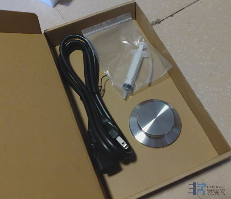 侧面纸盒内有美标电源线、针筒、软管和碟镇: