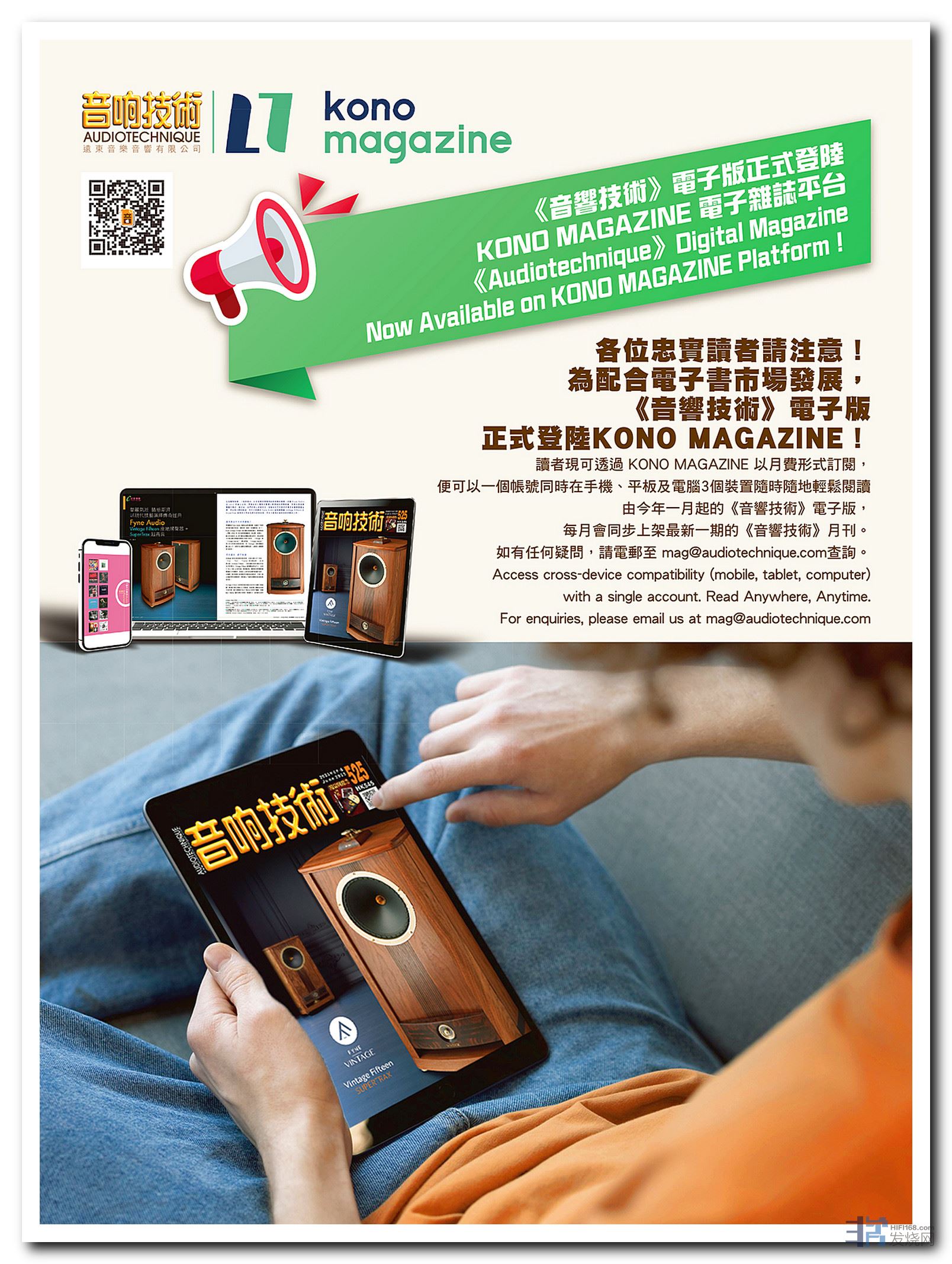 【音响技术】书刊在全港书报摊、音响店、CD店铺有售。《音响技术》电子版现已在电子杂志平台KONO MAGAZINE上架,读者可在该平台以月费形式订阅,便可以一个账号同时在手机、平板及计算机3个装置轻松阅读《音响技术》电子版。