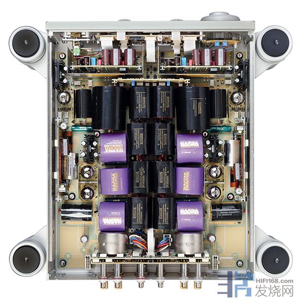 上图:双单声道布局具有输入负载和MC变压器,在EQ电路中有四只EF806S五极电子管。高压电源单元旁路、级间耦合和输出耦合采用定制的[黑色/紫色]SCR电容。两个E88CC三极管构成最终的+6dB/0dB/-6dB增益和输出级
