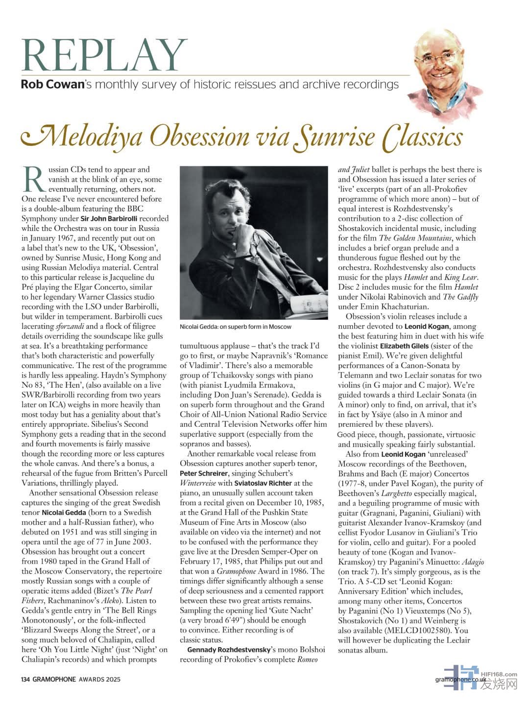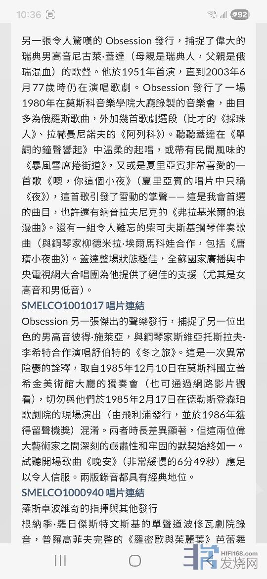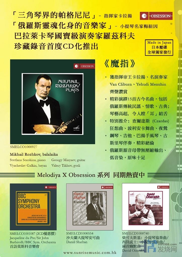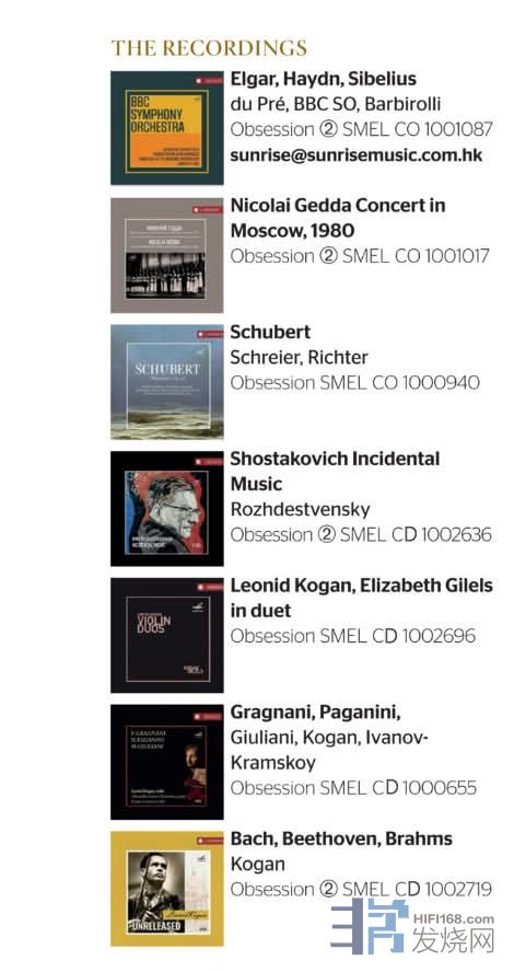 因為音樂,拉近了距離!由香港公司制作發行的古典唱片<執念系列[/fo ANDRE 发表于 2025/10/24 14:05:36 Deep Seek譯文 : 旋律唱片公司的「Obsession」系列俄羅斯的CD總是時隱時現,有的最終重返市場,有的則銷聲匿跡。一張我從未見過的發行,是雙專輯形式,內容是BBC 交響樂團在約翰·巴比羅利爵士指揮下,於1967年1月在俄羅斯巡演時的錄音。這張專輯最近由香港 上揚愛樂(SunriseMusic)旗下、在英國新出現的品牌「Obsession」發行,使用的是俄羅斯旋律唱片公司(Melodiya)的母帶。這張專輯的核心是賈桂琳·杜·普蕾演奏的艾爾加大提琴協奏曲,與她傳奇性的華納古典錄音室錄音(與巴比羅利指揮的倫敦交響樂團合作)相似,但氣質更為奔放。巴比羅利帶出了撕裂般的強音和大量精雕細琢的細節,如海鷗般盤踞於音景之上。這是一場令人屏息、極具個人特色且充滿強大感染力的演出。 其餘曲目同樣引人入勝。海頓第83號交響曲《母雞》(兩年後巴比羅利與西南廣播交響樂團的現場錄音也可在ICA 找到)比當今大多數演繹都更為厚重,但其中洋溢的親切感恰到好處。西貝流士第二號交響曲的詮釋在第二和第四樂章相當宏大,錄音或多或少捕捉到了整體的畫布。還有一個驚喜附贈:布瑞頓《浦賽爾主題變奏曲》中賦格曲的排練片段,演奏得激動人心。 另一張令人驚嘆的 Obsession 發行,捕捉了偉大的瑞典男高音尼古萊·蓋達(母親是瑞典人,父親是俄瑞混血)的歌聲。他於1951年首演,直到2003年6月77歲時仍在演唱歌劇。Obsession發行了一場1980年在莫斯科音樂學院大廳錄製的音樂會,曲目多為俄羅斯歌曲,外加幾首歌劇選段(比才的《採珠人》、拉赫曼尼諾夫的《阿列科》)。聽聽蓋達在《單調的鐘聲響起》中溫柔的起唱,或帶有民間風味的《暴風雪席捲街道》,又或是夏里亞賓非常喜愛的一首歌《噢,你這個小夜》(夏里亞賓的唱片中只稱《夜》),這首歌引發了雷動的掌聲——這是我會首選的曲目,也許還有納普拉夫尼克的《弗拉基米爾的浪漫曲》。還有一組令人難忘的柴可夫斯基鋼琴伴奏歌曲(與鋼琴家柳德米拉·埃爾馬科娃合作,包括《唐璜小夜曲》)。蓋達整場狀態極佳,全蘇國家廣播與中央電視網大合唱團為他提供了絕佳的支援(尤其是女高音和男低音)。 Obsession 另一張傑出的聲樂發行,捕捉了另一位出色的男高音彼得·施萊亞,與鋼琴家斯維亞托斯拉夫·李希特合作演唱舒伯特的《冬之旅》。這是一次異常陰鬱的詮釋,取自1985年12月10日在莫斯科國立普希金美術館大廳的獨奏會(也可通過網路影片觀看),切勿與他們於1985年2月17日在德勒斯登森珀歌劇院的現場演出(由飛利浦發行,並於1986年獲得留聲機獎)混淆。兩者時長差異顯著,但這兩位偉大藝術家之間深刻的嚴肅性和牢固的默契始終如一。試聽開場歌曲《晚安》(非常緩慢的6分49秒)應足以令人信服。兩版錄音都具有經典地位。 羅斯卓波維奇的指揮與其他發行根納季·羅日傑斯特文斯基的單聲道波修瓦劇院錄音,普羅高菲夫完整的《羅密歐與茱麗葉》芭蕾舞劇,或許是現有最佳版本;而Obsession 發行了一套較晚的「現場」選段(全部為普羅高菲夫作品節目的一部分,詳情後述)。但同樣有趣的是羅日傑斯特文斯基對一套2CD蕭士塔高維奇戲劇配樂合集的貢獻,包括電影《金山》的配樂,其中包含簡短的管風琴前奏和一首由樂隊充實起來的雷霆萬鈞的賦格曲。羅日傑斯特文斯基還指揮了戲劇《哈姆雷特》和《李爾王》的配樂。第二碟包括尼古拉·拉比諾維奇指揮的電影《哈姆雷特》配樂,以及埃敏·哈察圖量指揮的《牛虻》配樂。 Obsession 的小提琴發行中,包括一套專門獻給萊奧尼德·柯崗的專輯,其中最佳的一張是他與妻子——小提琴家伊莉莎白·吉列爾斯(鋼琴家埃米爾·吉列爾斯的姐姐)的二重奏。我們可以欣賞到泰勒曼的一首《卡農-奏鳴曲》和兩首勒克萊爾的雙小提琴奏鳴曲(G大調和C大調)的愉快演出。曲目單還引導我們期待第三首勒克萊爾奏鳴曲(A小調),結果發現實際上那是伊薩伊的作品(也是A小調,並由這些演奏家首演)。不過這仍是首好作品,充滿激情、技巧精湛,且在音樂上相當有份量。 同樣來自萊奧尼德·柯崗的還有「未發行」的莫斯科錄音:貝多芬、布拉姆斯和巴赫(E大調)小提琴協奏曲(1977-78年,由帕維爾·柯崗指揮),其中貝多芬《廣板》的純淨尤其迷人;以及一套與吉他手亞歷山大·伊萬諾夫-克拉姆斯科伊(以及在朱利亞尼的三重奏中加入大提琴手費奧多爾·盧薩諾夫)合作、與吉他搭配的迷人曲目(格拉尼亞尼、帕格尼尼、朱利亞尼)。要體驗音色的融合之美(柯崗和伊萬諾夫-克拉姆斯科伊),請聽帕格尼尼的《小步舞曲:慢板》(第7軌)。它簡直美極了,三重奏亦是如此。一套5CD的《萊奧尼德·柯崗:週年紀念版》(MELCD1002580)也已發行,其中包含帕格尼尼(第1號)、維厄當(第5號)、蕭士塔高維奇(第1號)和魏因貝格等人的協奏曲,以及其他眾多曲目。不過,這會與勒克萊爾奏鳴曲專輯內容重複。