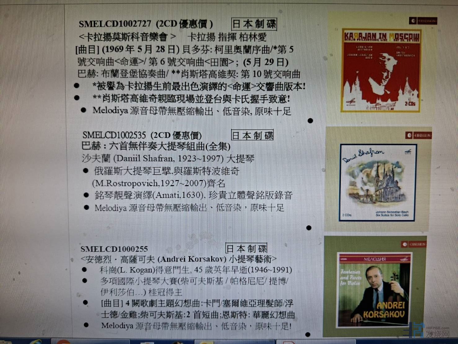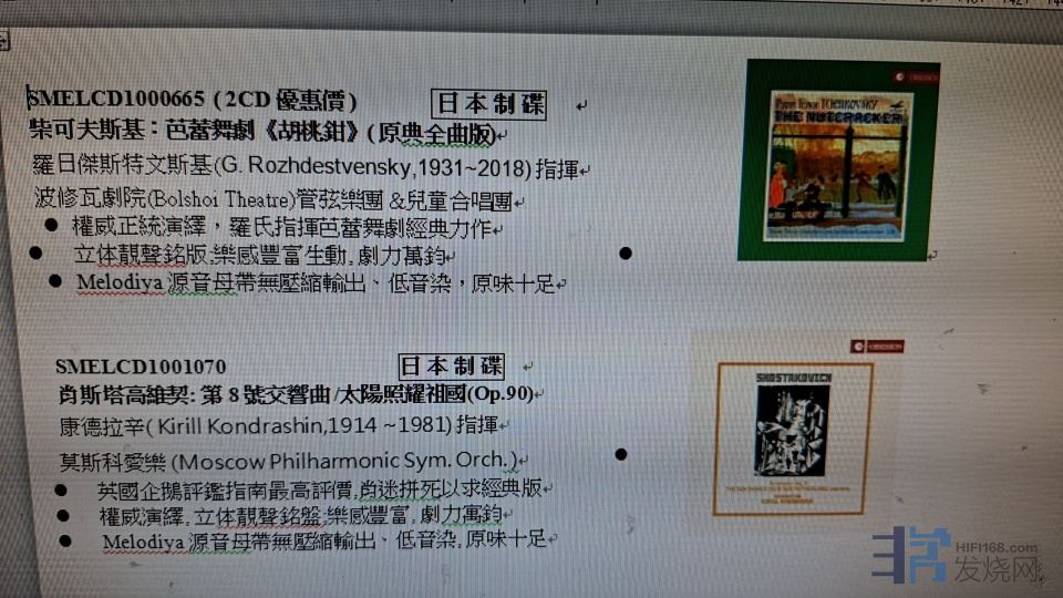 延伸参阅https://weibo.com/2518372443/QgQZEhlDJhttps://weibo.com/2518372443/QgQ7rcUFw2025/12/18 新品 上市SMELCD1000665 ( 2CD優惠價 ) 日 本 制 碟 柴可夫斯基:芭蕾舞劇《胡桃鉗》( 原典全曲版)羅日傑斯特文斯基(G. Rozhdestvensky,1931~2018) 指揮波修瓦劇院(BolshoiTheatre)管弦樂團 &兒童合唱團l 權威正統演繹,羅氏指揮芭蕾舞劇經典力作l 立体靚聲銘版;樂感豐富生動, 劇力萬鈞Melodiya 源音母帶無壓縮輸出、低音染,原味十足SMELCD1001070 日 本 制 碟 肖斯塔高維契: 第8號交響曲 /太陽照耀祖國(Op.90)康德拉辛( Kirill Kondrashin,1914~1981) 指揮莫斯科愛樂 (Moscow Philharmonic Sym. Orch. )l 英國企鵝評鑑指南最高評價,肖迷拼死以求經典版l 權威演繹, 立体靚聲銘盤;樂感豐富, 劇力寓鈞Melodiya源音母帶無壓縮輸出、低音染, 原味十足 ANDRE 发表于 2025/12/16 9:13:09