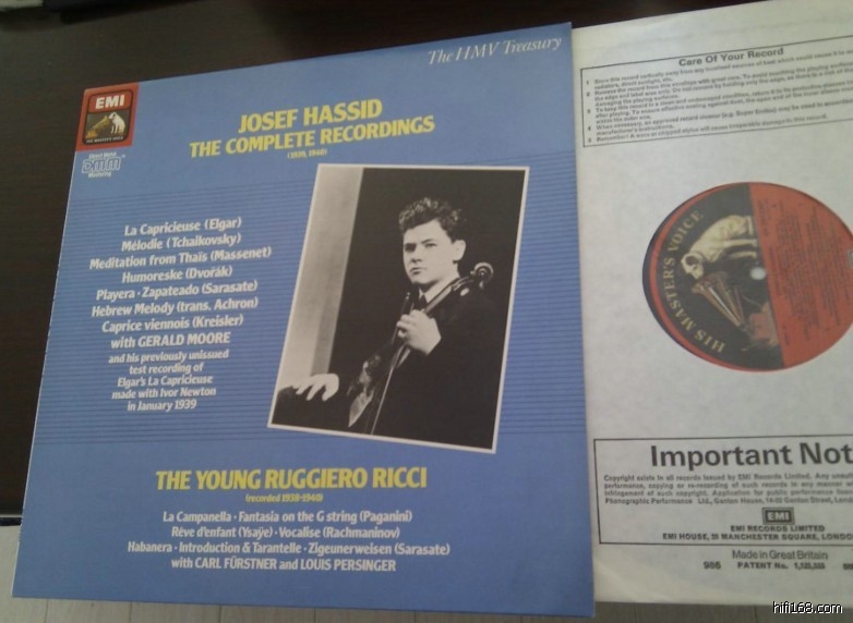 Recollections 在 2003-9-8 10:56:44 发表的内容 "哈西德就是Josef Hassid(1923-1950),他留下来的只有8首小品的录音"CD不是唱片麼一回事,我有他在EMI出版的唱片,是和Ricci各佔一面,只聽Hassid一首沉思曲Meditation已經流出耳油了。可惜此片已絕版,二手市場又不多見,市價已炒高至HK$800大元了。
