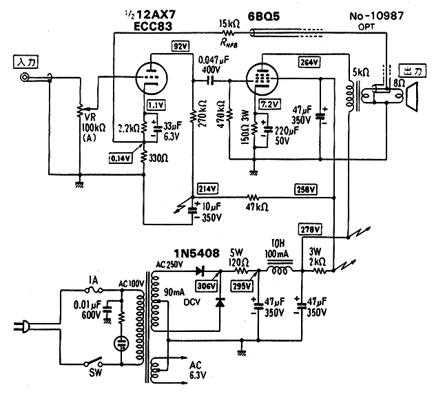 今天心血来潮,按下图改制了我的EL84小单端。和原来的线路相比,增加了第一级的放大倍数,全机的放大倍数也增加了。耦合还是TCC瓷封,阴极电容是Philips的轴向和80S的Mallory的FP235,滤波我换上了刚激活的的66年Mallory。用GEC的B339和Valvo的碟片EL84开声。明显比原来的线路声音好。感觉原来的线路增益是低了些,动态,低频的量感不足。