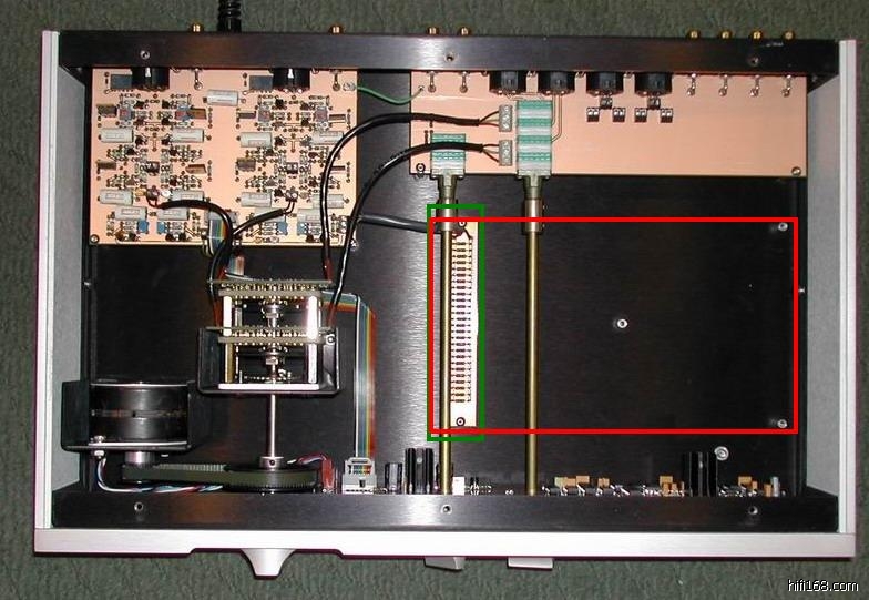 顾兄所说的板应该就是图中我用绿框画出的,如果装了唱放板,这块板就要拿掉,取而代之是红框大小的一块PHONO放大板(可惜没有图留下)。
