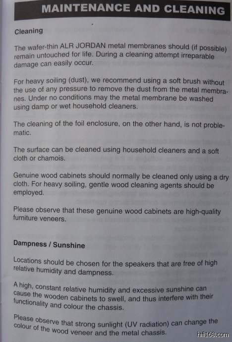 保养:尽量不要用手触摸金属振膜,以免损伤振膜,如果灰尘实在太多,我们建议用软毛刷在不加压力的情况下拂去振膜表面的灰尘。绝对不能用水洗,也不能用干或湿的家具用清洁剂。木皮只能用干布擦拭。ALR Jordan的箱体是以高品质家具木为标准建造的。