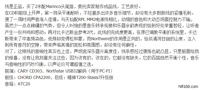 我身边也有个大烧把银彩G6电源线的原装头换成了古河的碳素头,虽然古河的东西也有好有坏(我自己的前端也在用GTX-D镀铑墙插),但又有几个烧友会买几百元的线去配2千多的插头呢?更何况是否搭也是一个未知数。所以,大家可以大胆尝试,但是我所描述Northwire的声音特质都是用无镀层的接头所呈现出的。换了其他插头,声底不会变,但有些很宝贵的特质是否能保留还需要各位尝试后跟大家分享。