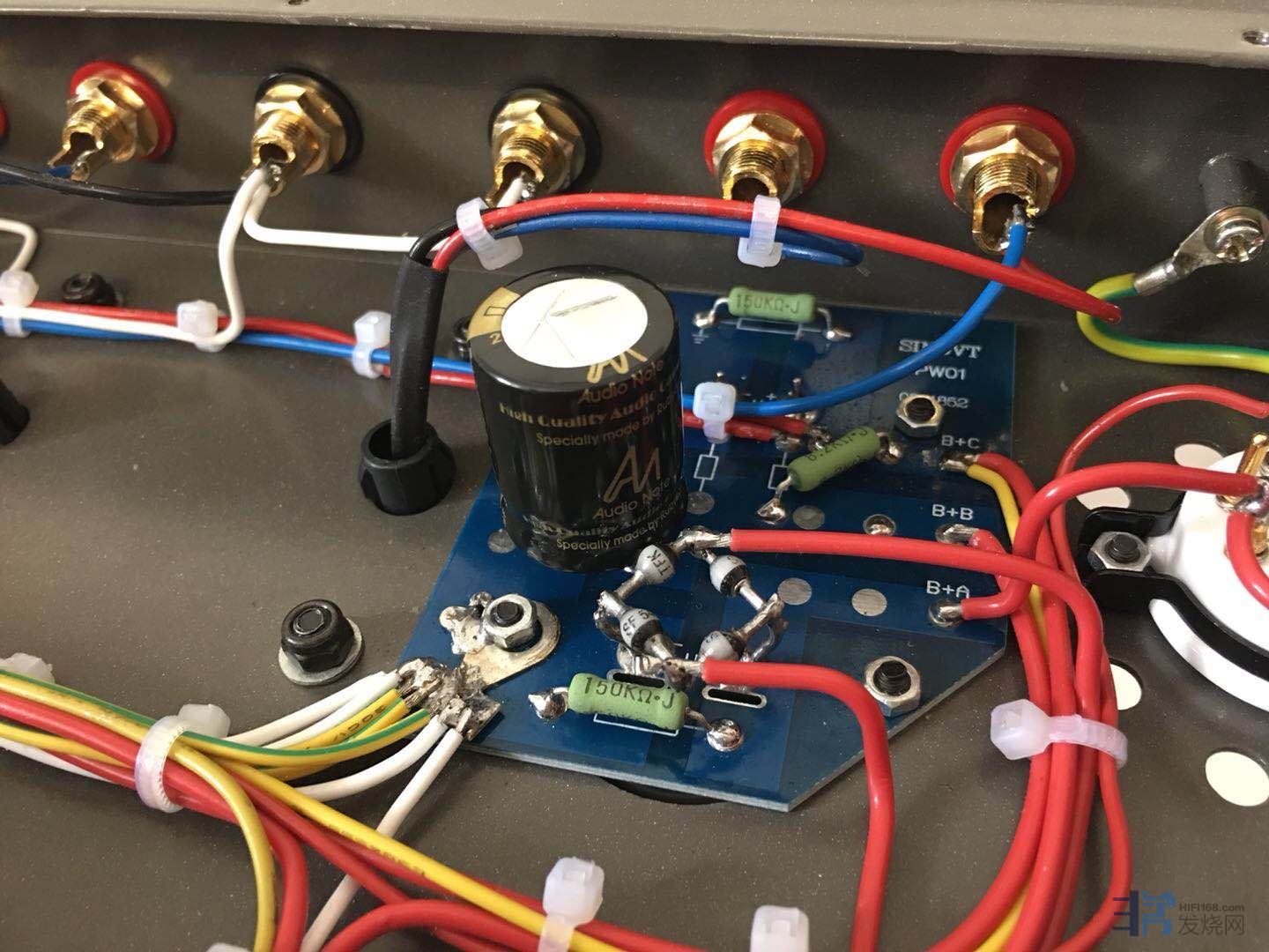 去年10月做了台300B胆机,意犹未尽,打算再做台6L6单端甲类胆机。想到上次加工机箱的艰辛,这次买了拉菲尔6SQ7推6L6套件。机箱、牛、胆管用套件的,其余的都换掉。电路略做了修改,6SQ7灯丝改直流供电。高压整流用德律风根3A整流子,高压和灯丝滤波用AudioNote STD,阴极电容用AudioNote 快晴。耦合用Jensen 铜铂铝管,电阻用金威,管座用Eizz瓷座,CD输入用卡达斯信号线,机内走线用0.5和1平方纯铜镀锡线(这个线很好,好友给的,用在十万元级某国产胆机上的),全部使用卡达斯含银焊锡焊接。做好后用Spendor S3/5和享声A200试听,声音舒服、柔和有胆味。噪音极低,耳朵贴在喇叭上只能听到很微弱的!