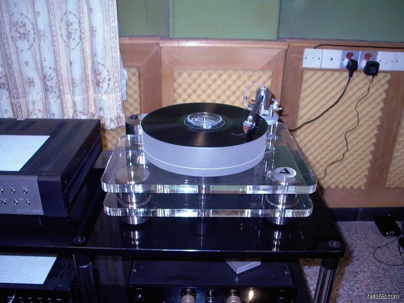 经过接近两个小时的精心装配调较(调较LP当然少不了专用的电子调较仪)可以上架上试听了,第一张开声的软件就是转盘附送的“大针板”,试听用的唱放是同转盘同一厂家的最低型号唱放开声。
